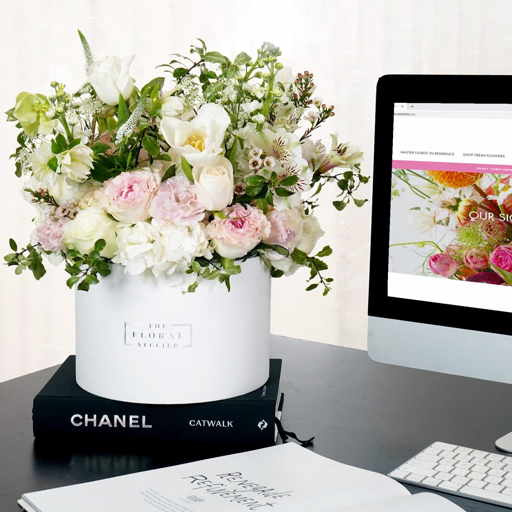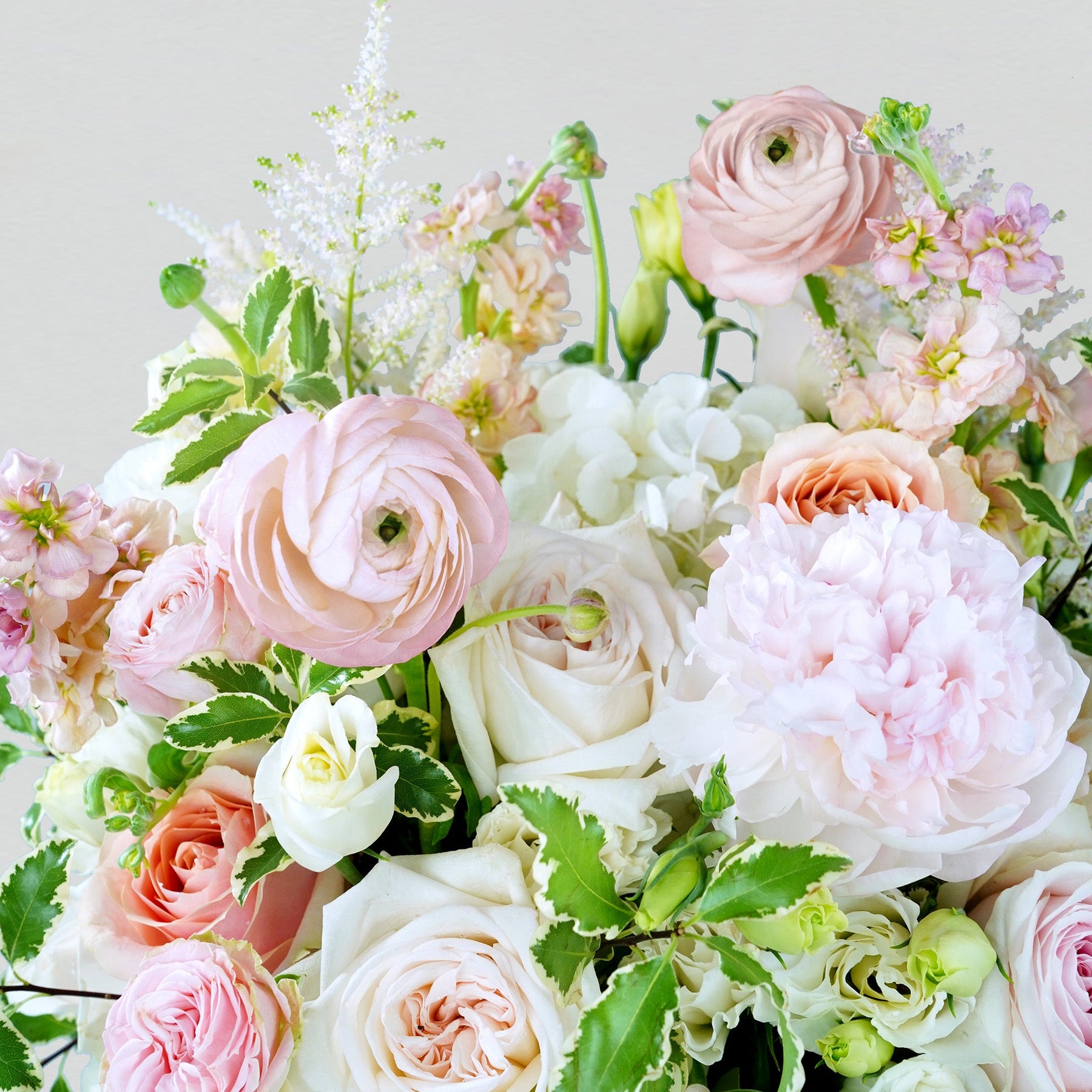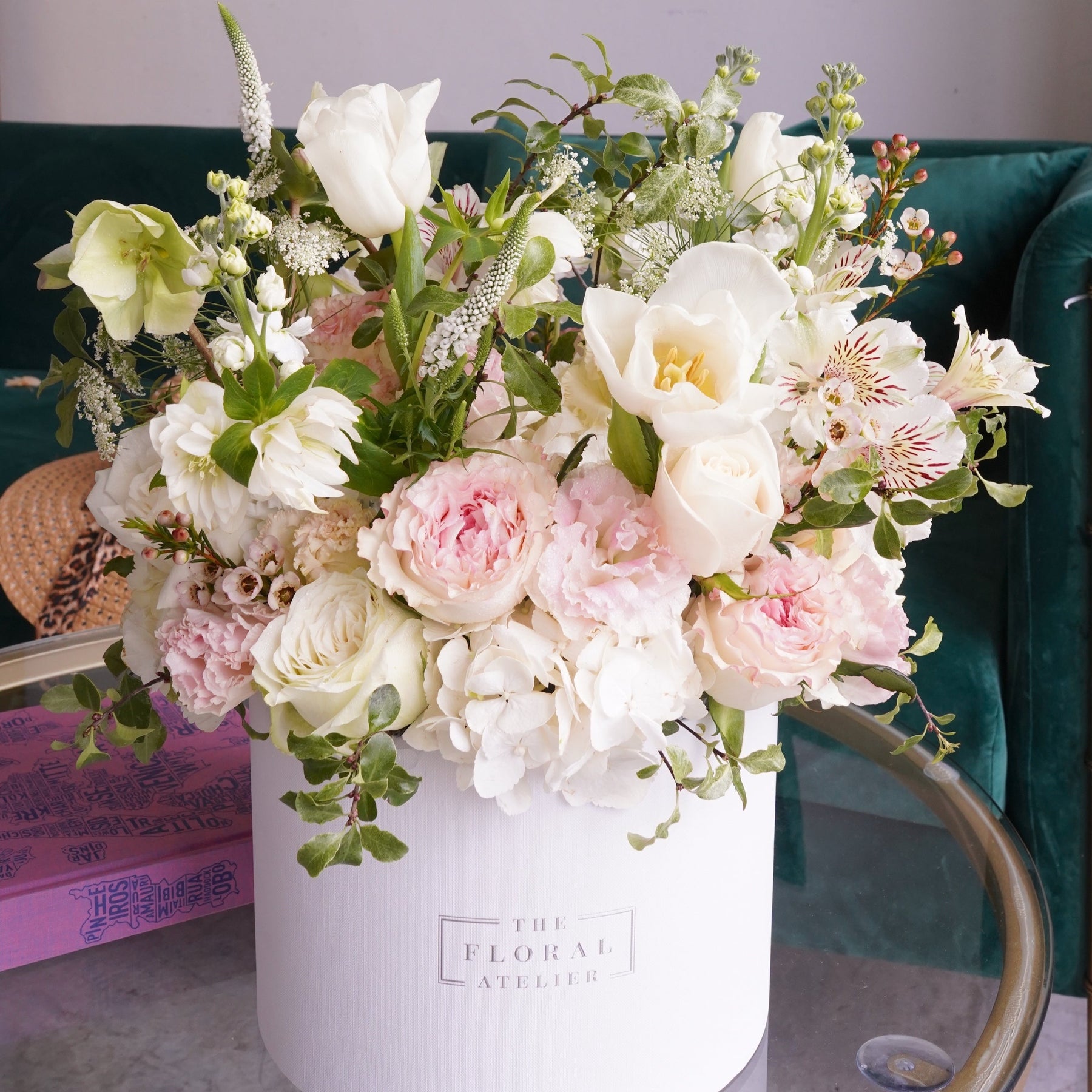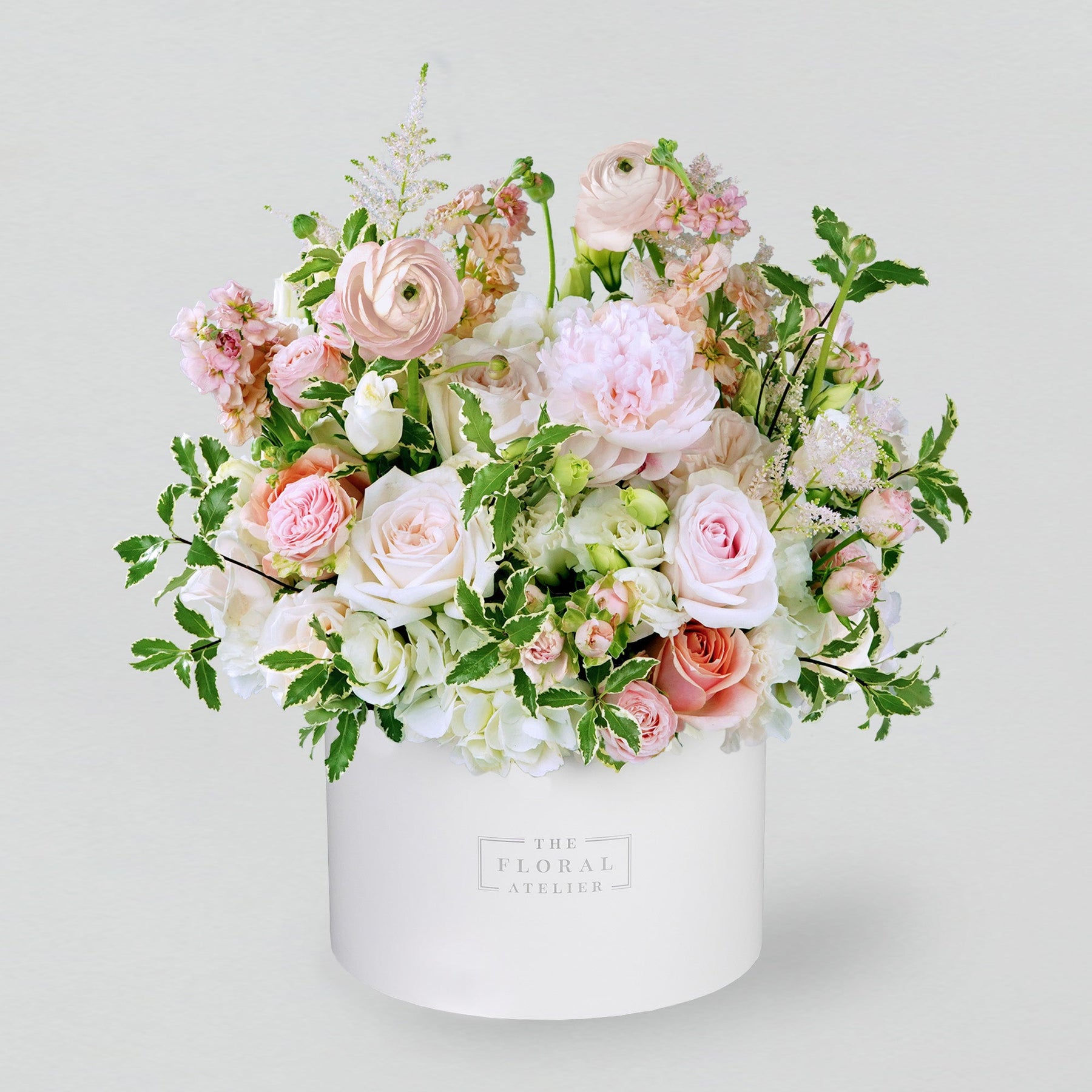 "Sarah Bernhardt" Peonies, "Hanoi" ranunculus, and garden roses highlight the multitude of soft and elegant shades to choreograph a dramatic and beautiful sequence in our Signature Ballerina Bloom Box. Inspired by the classic ballerina as a muse, this meticulously crafted performance between the premium florals and captivating palette of colors brings to life a work of art that never fails to elevate its audience. Luxury, Beauty, and Exceptionally created in Singapore.