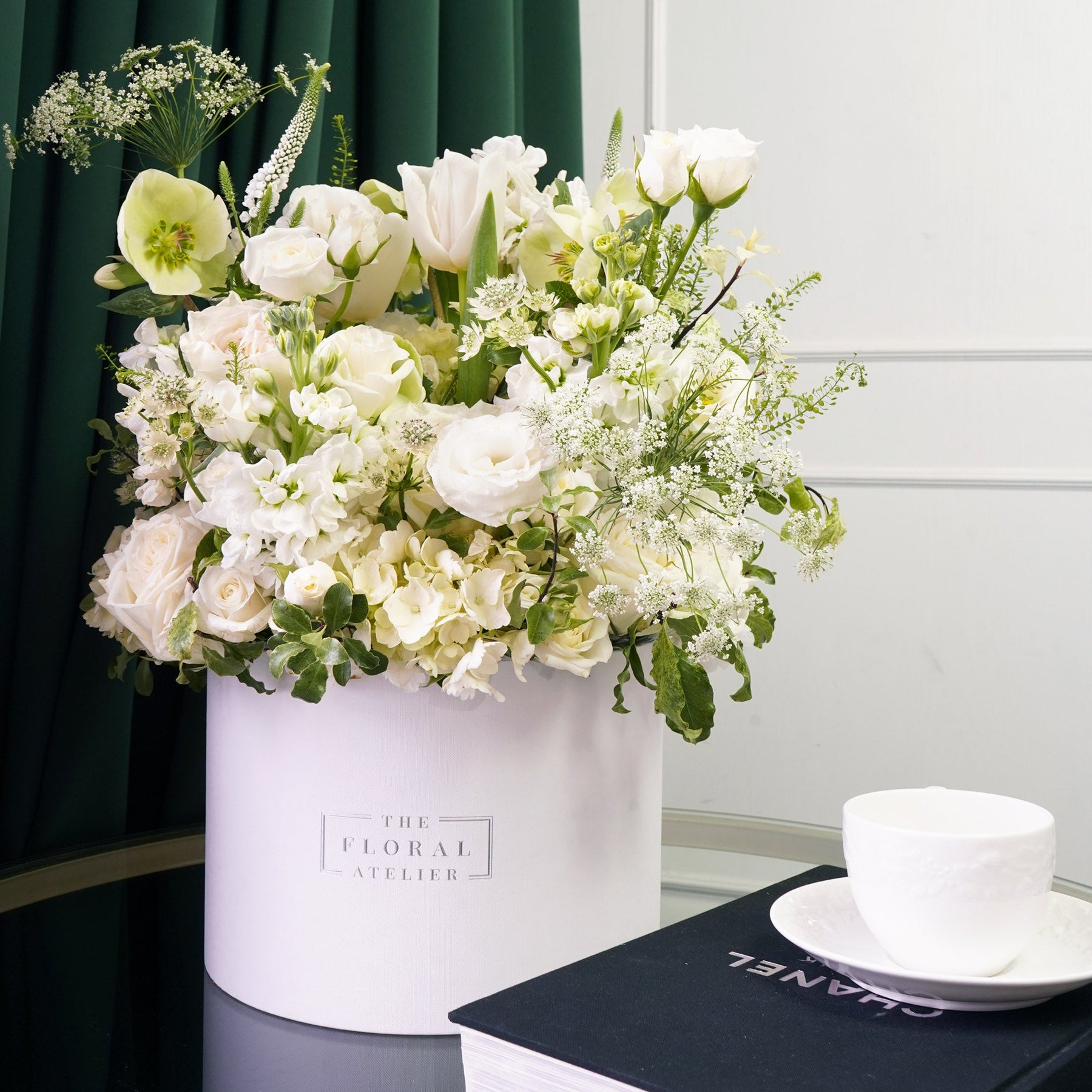 "Bowl of Cream" peonies, "Blushing Pascal" ranunculus, and premium roses come together to form an understated but strikingly elegant bloom box. Evoking our memory of innocence and possibilities, this timeless and gentle assembly of beautiful blooms with understated palette of white tones transports its audience back to the days of pure joy. Luxury, Beauty, and Exceptionally created in Singapore.