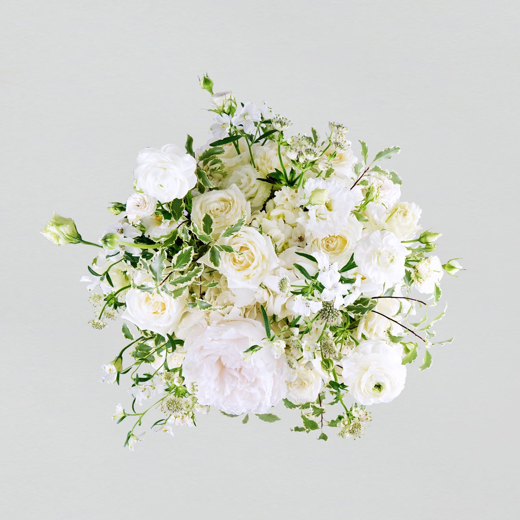 A top view of a flower arrangement consisting of a range of white and ivory tones ofpremium peonies, roses, eustomas, and green foliages, beautifully crafted into our signature white bloom box.