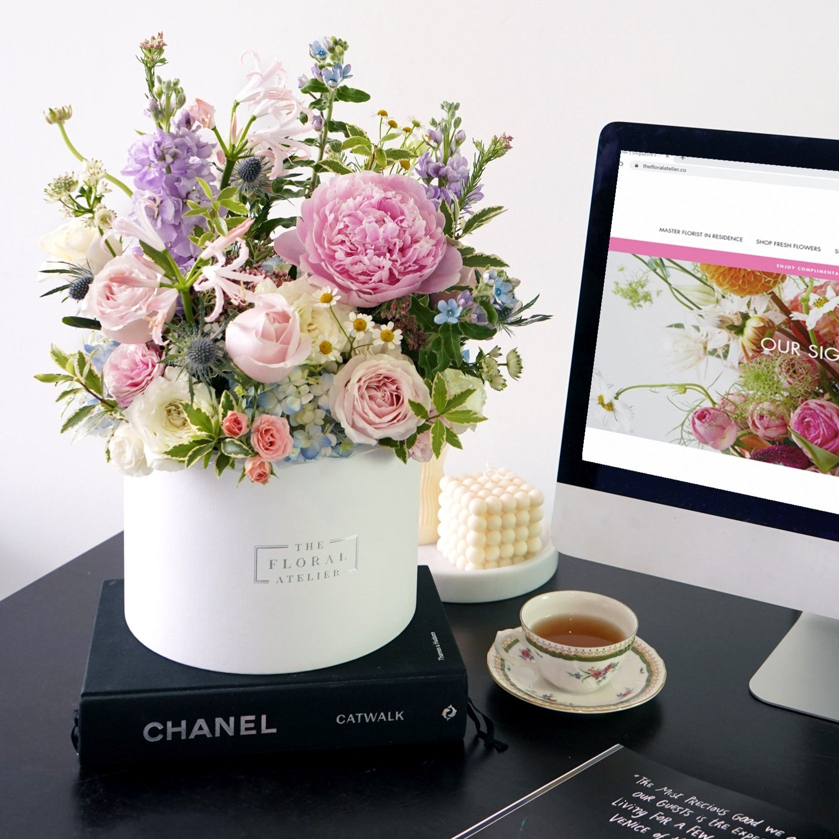 "Duchesse de Nemours" peonies, lilac delphiniums, and seasonal premium purple roses highlight this stunningly beautiful and whimsically elegant bloom box. While innocent naivety may have been the inspiration, this piece projects everything that is sophisticated and beautiful, with timeless and elegant blooms in complimentary but understated palette of white, pink, and blue tones. Luxury, Beauty, and Exceptionally created in Singapore.