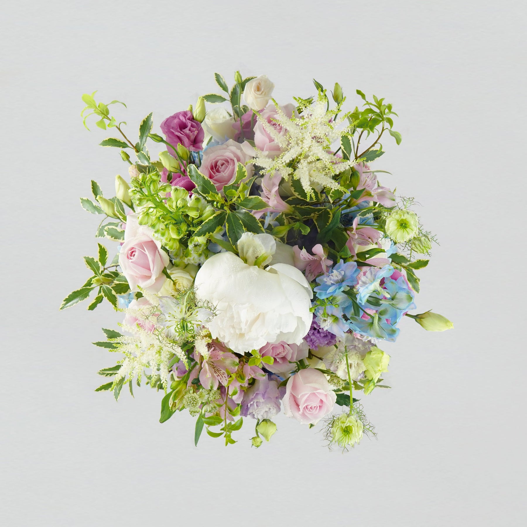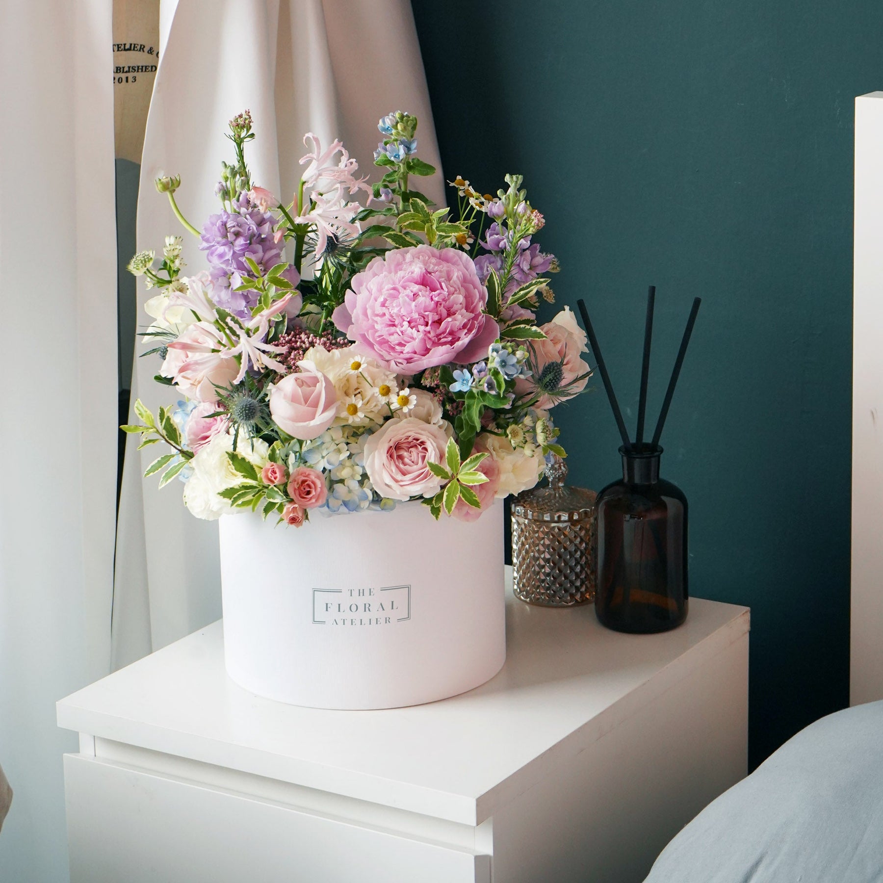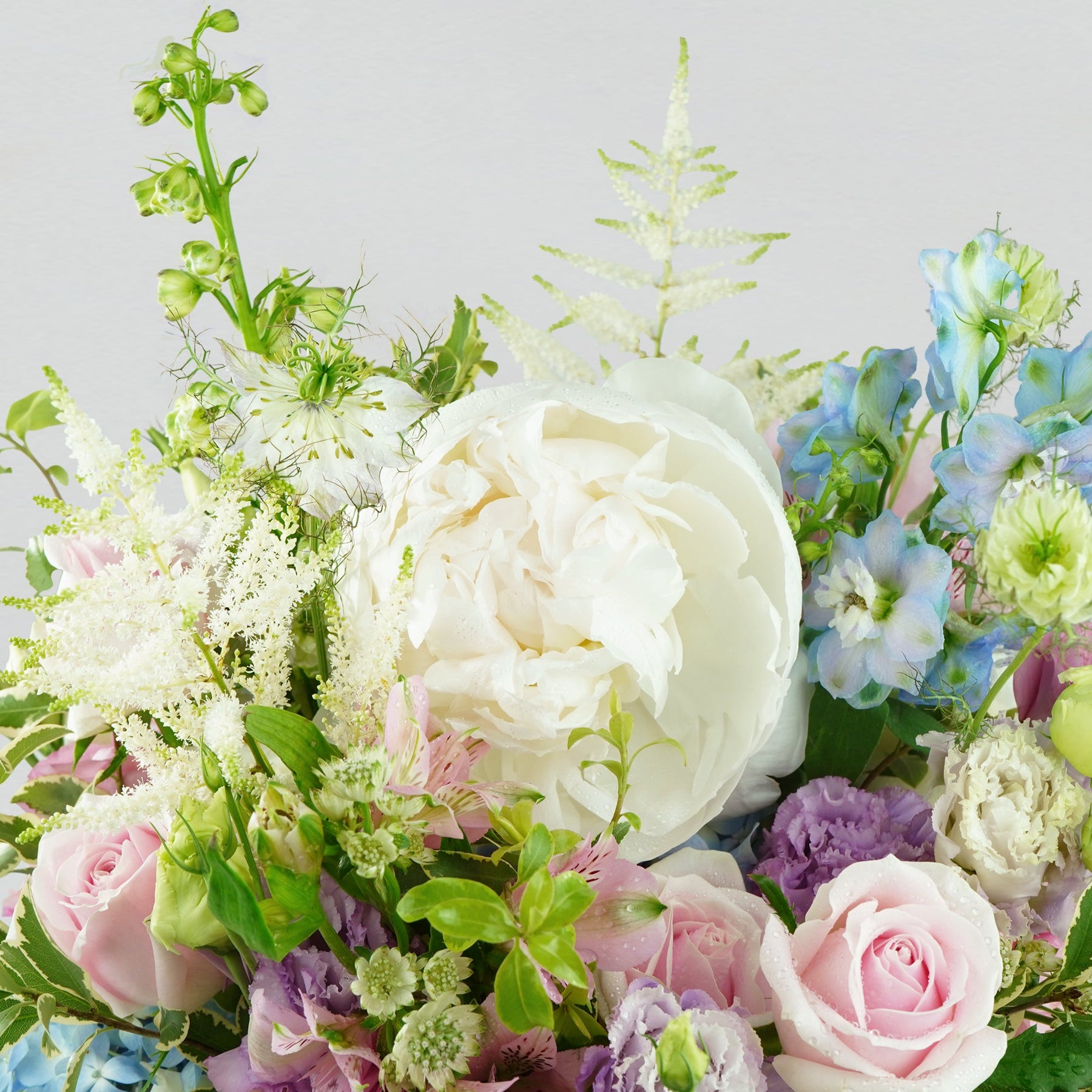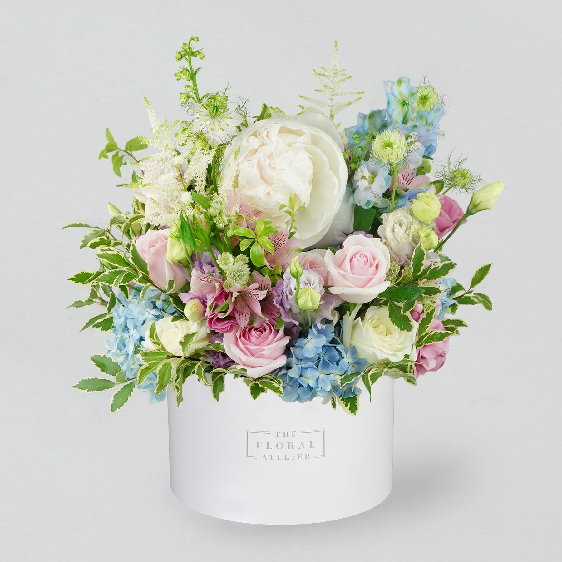 A flower arrangement consisting of a range of pastel pink, blue, and light purple tones of premium peonies, roses, hydrangeas, eustomas, and green foliages, beautifully crafted into our signature white bloom box.