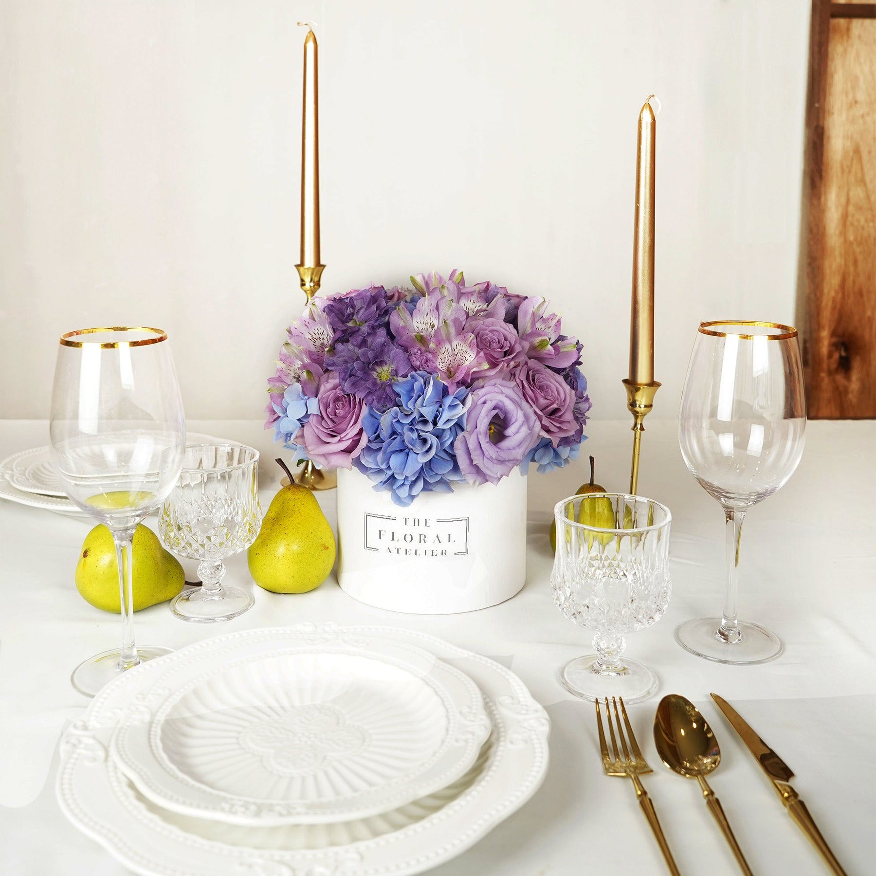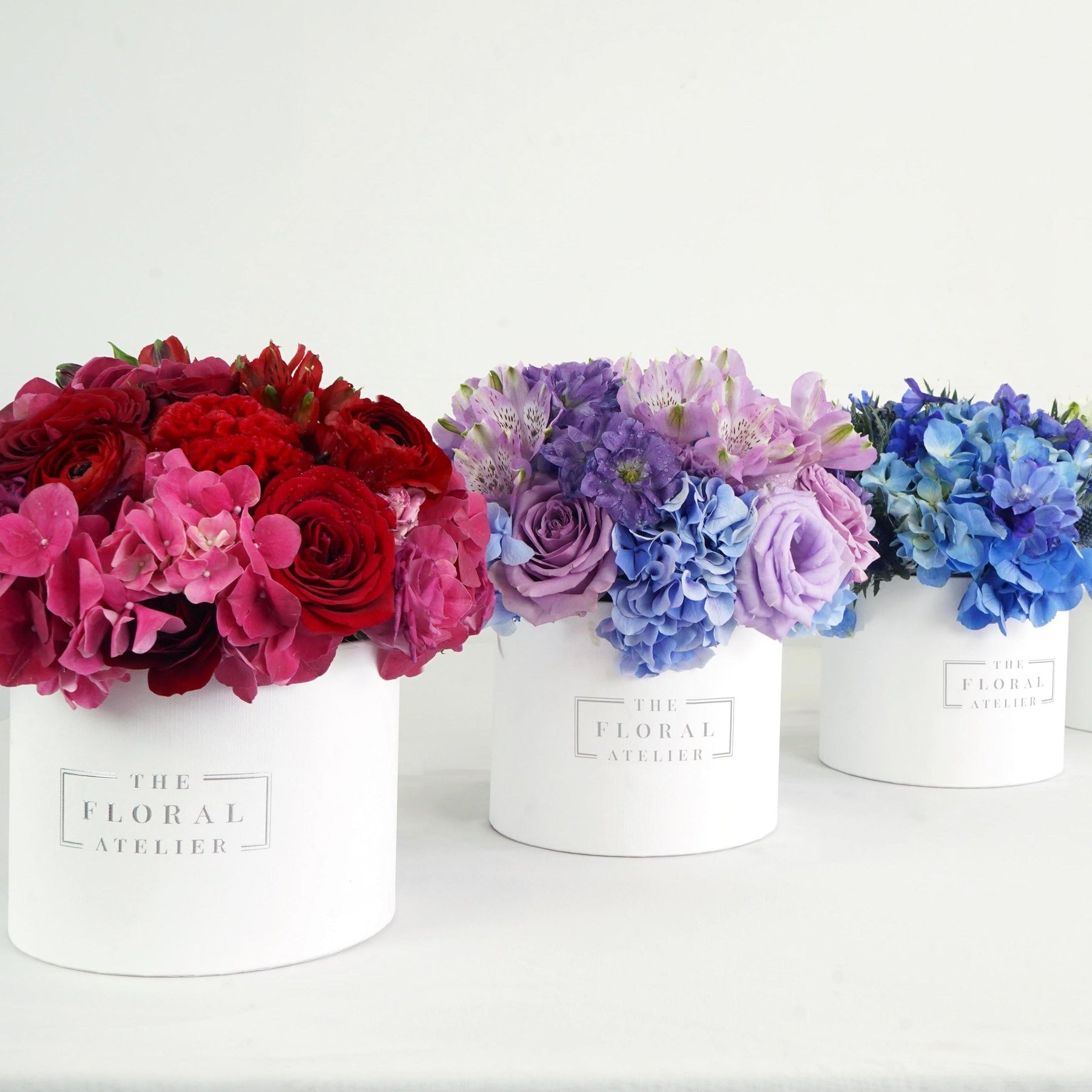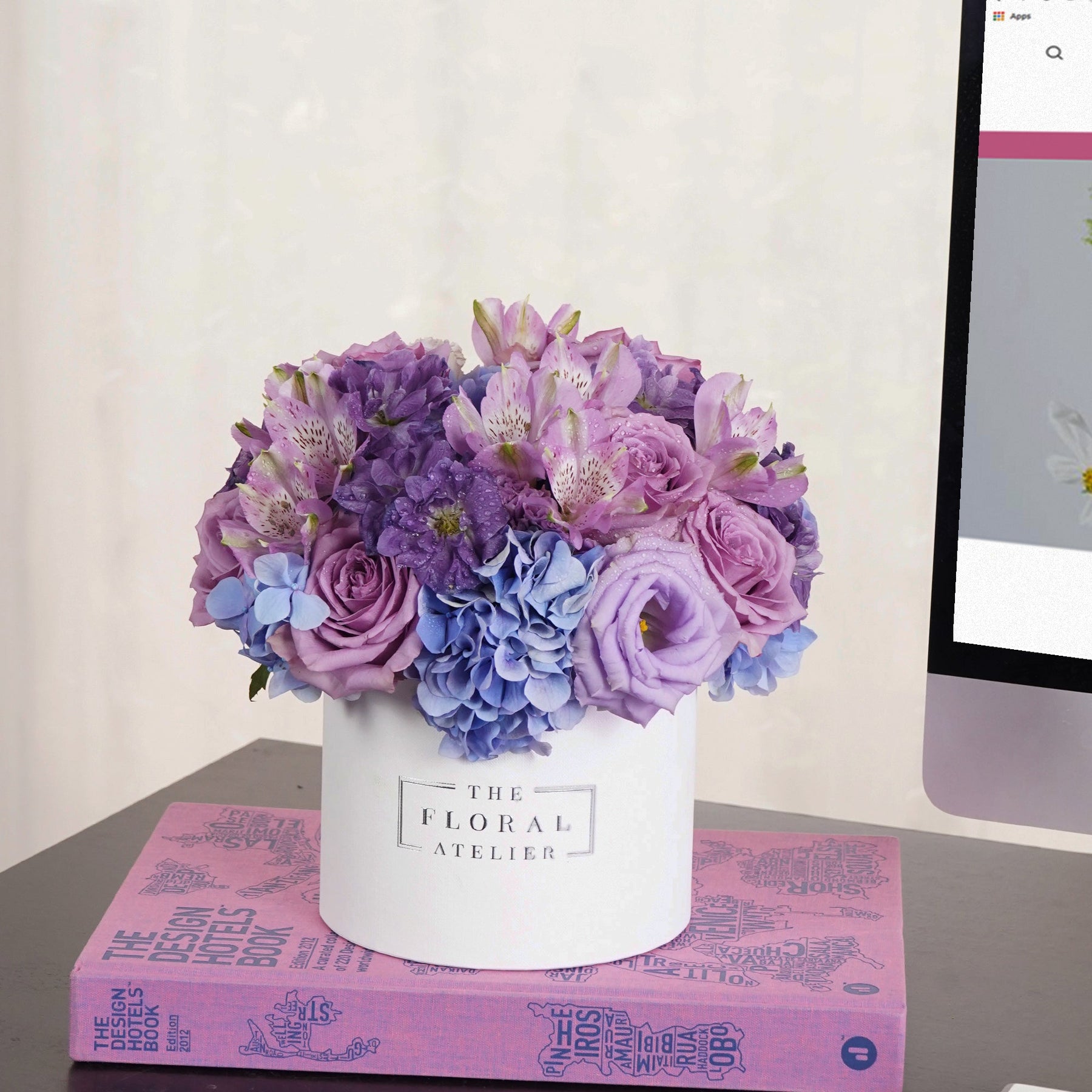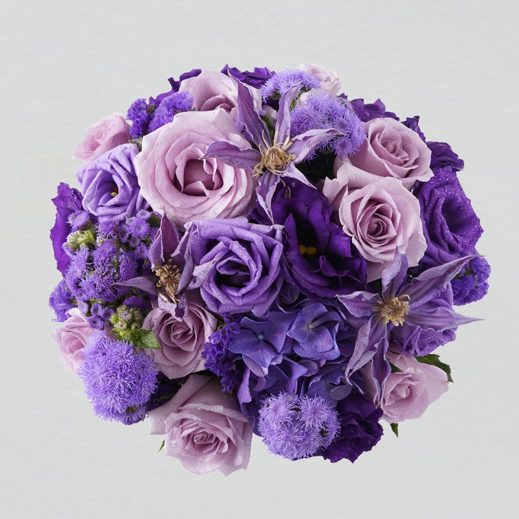 Royal, pink, and lilac purple bluemink, premium roses, and hydrangeas form a majestic and stunning floral work of art. Lovingly designed and crafted in our signature bloom box. This beauty aims to inspire the dreamers and draw out that creative passion in all of us. Beauty, Luxury, and Exceptionally crafted in Singapore.
