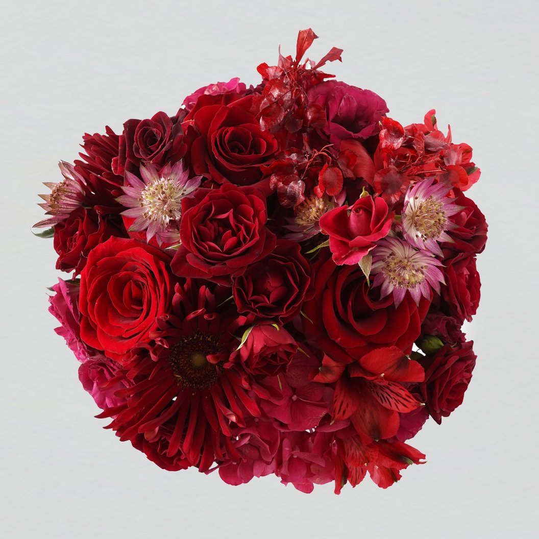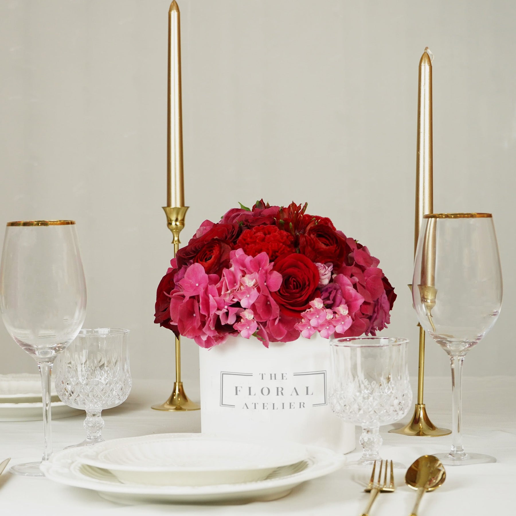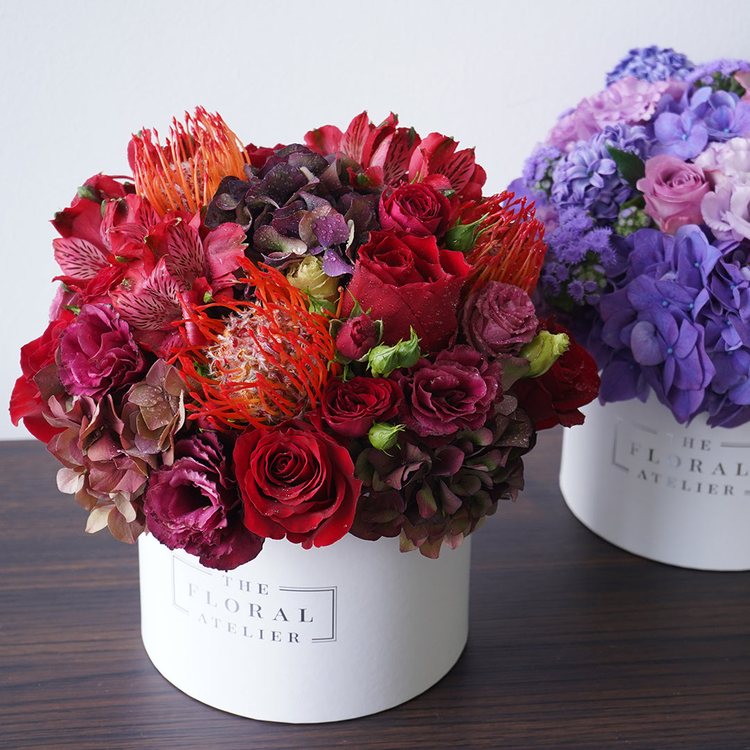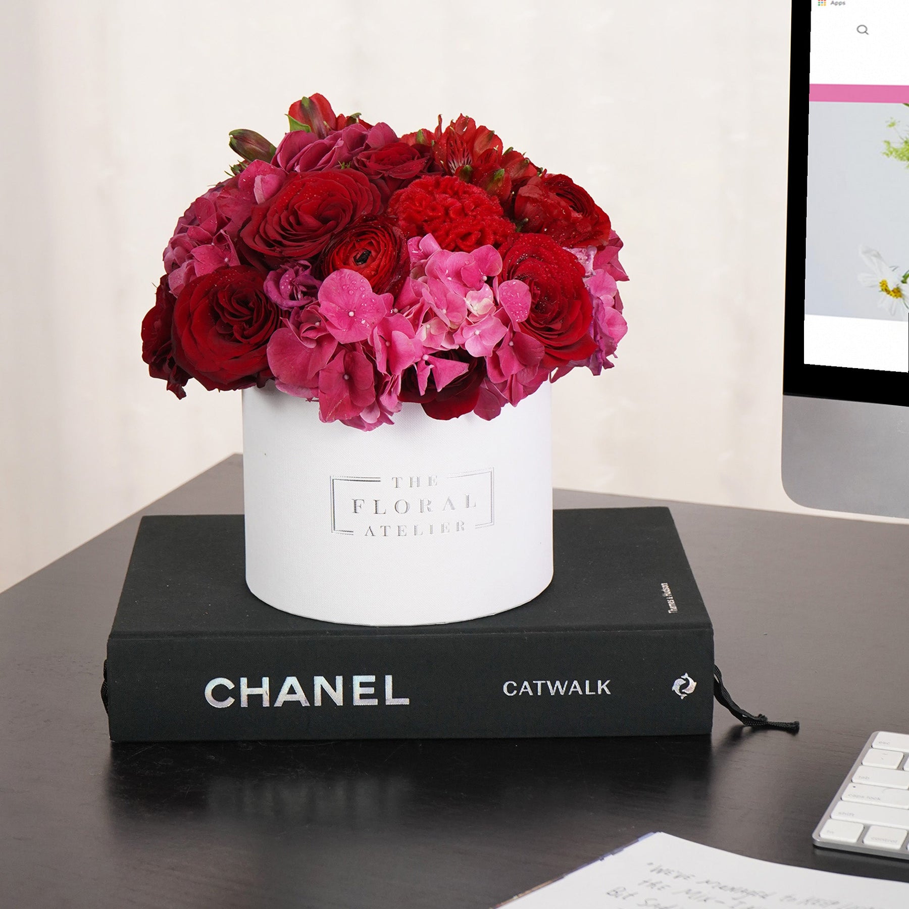 Deep crimson and red-hued blushing brides, premium roses, eustomas, and eucalyptus seeds are meticulously assembled to magnify the intensity of the palette of reds to amplify the expression of love. Expertly designed and crafted in our signature bloom box to deliver the most important message of all in an impactful manner.
