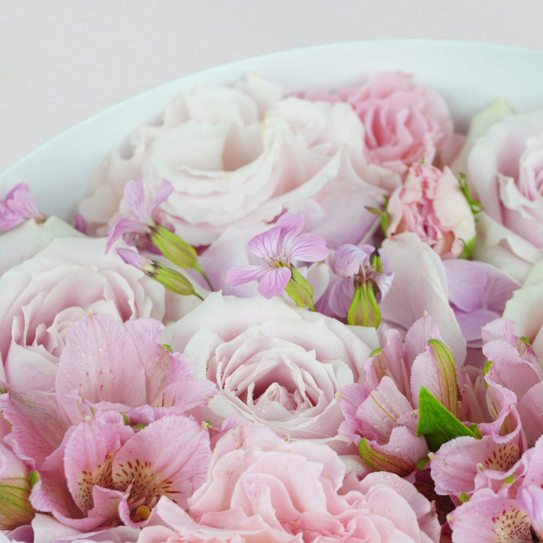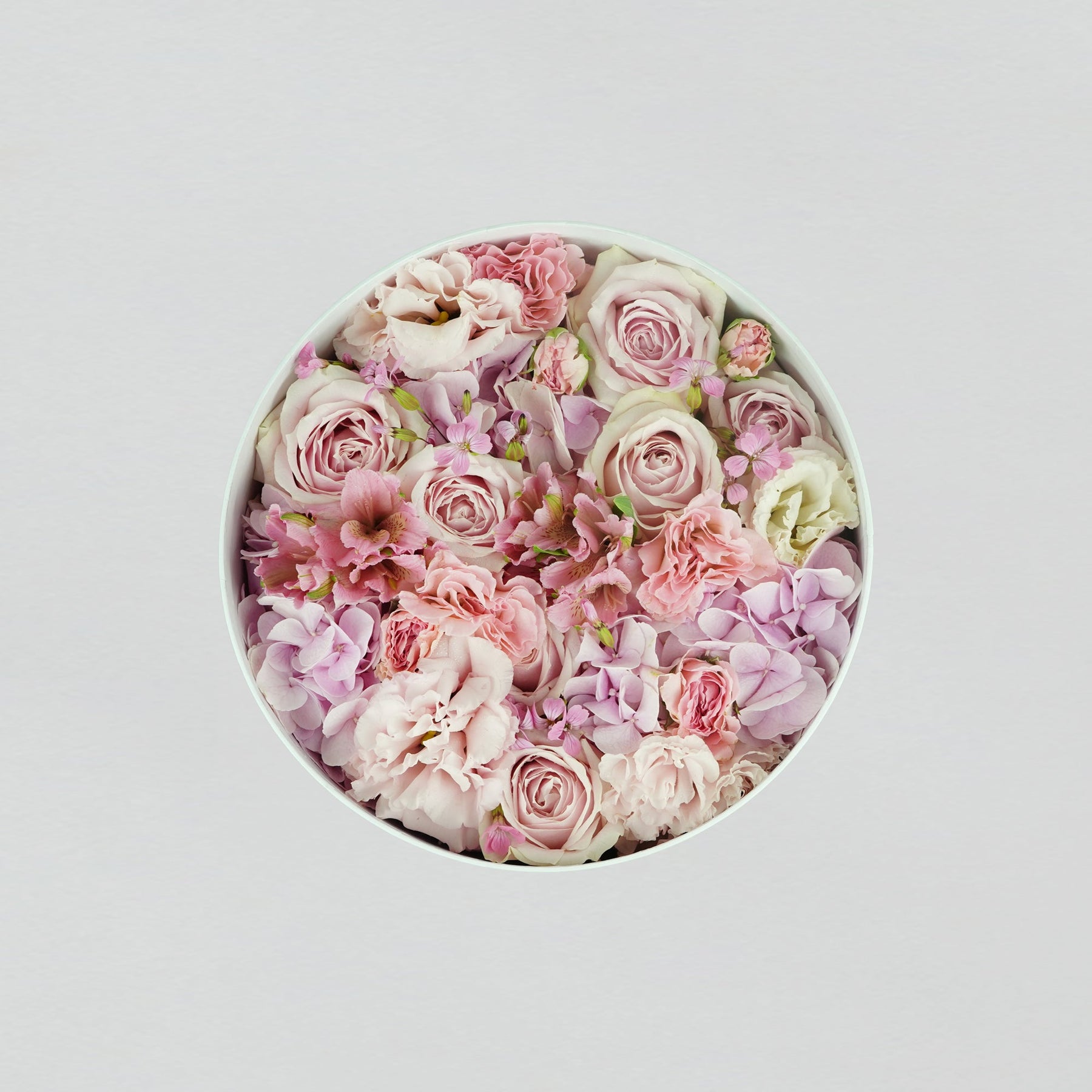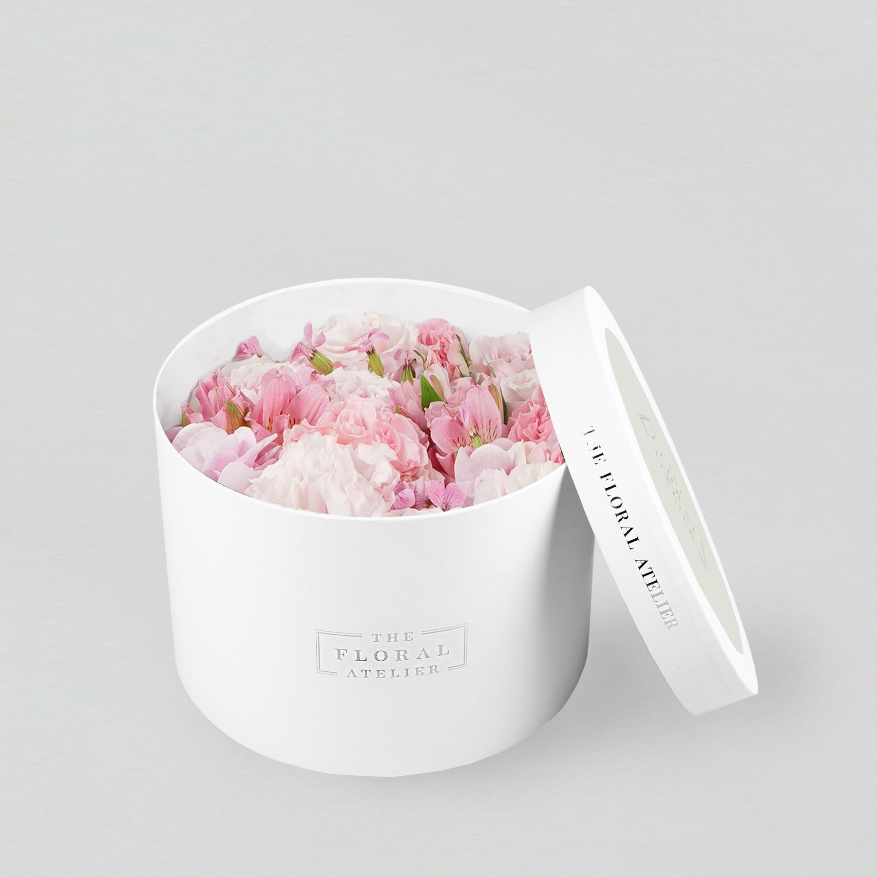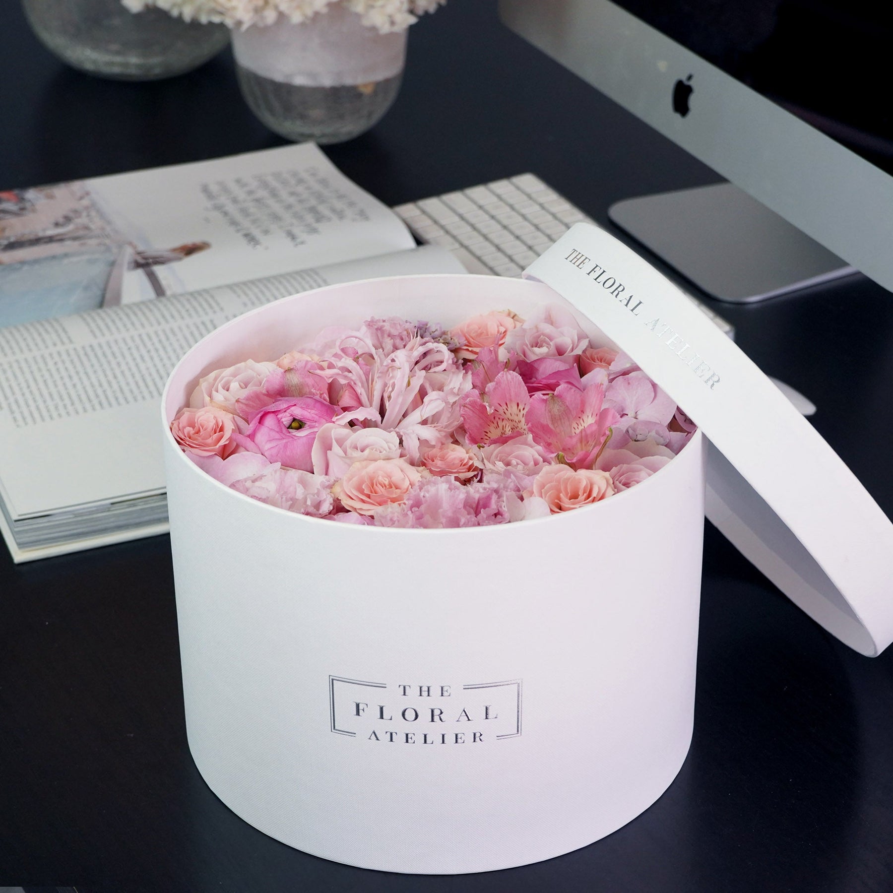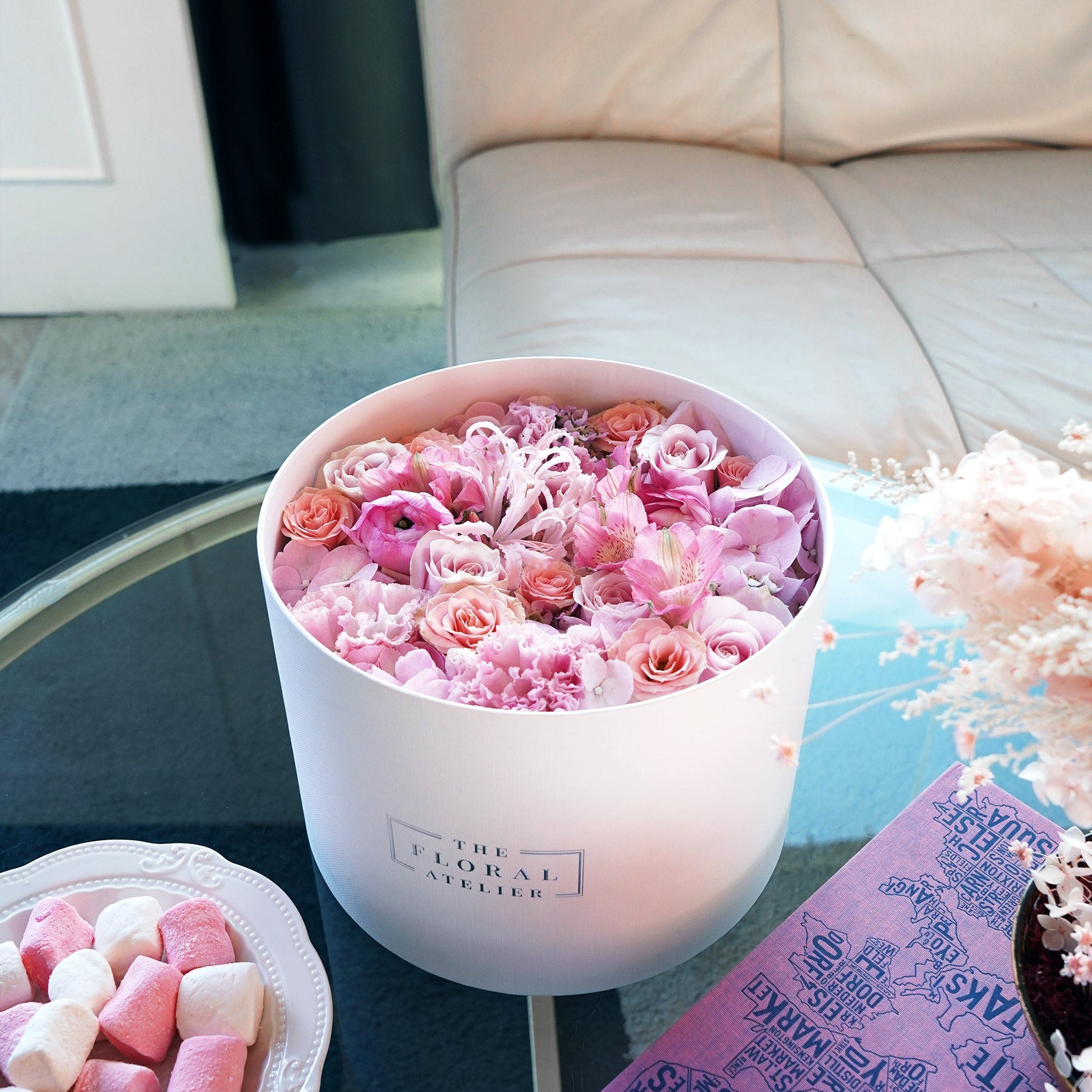 Sugar pink hydrangeas, pastel pink premium roses, and pink eustomas star as a medley of romantic pink florals that tickle the senses and flirt with romantic notions. Gently and meticulously assembled in our signature bloom box to create a secret garden to be revealed and discovered. Beauty, Luxury, and Exceptionally crafted in Singapore.
