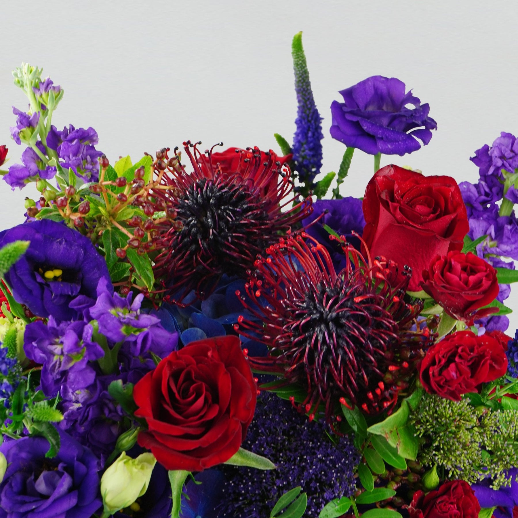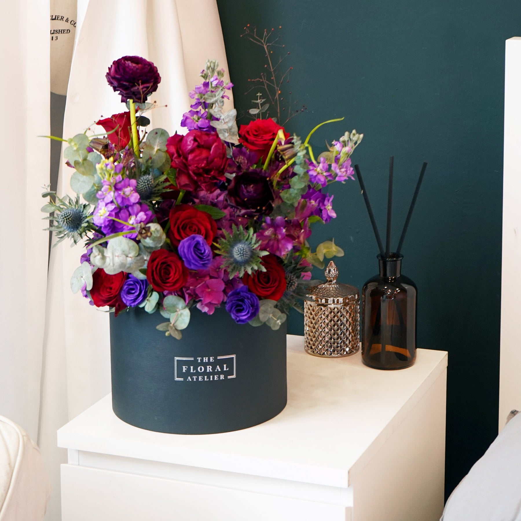 Fresh flowers in purple and red arranged in a round grey bloom box