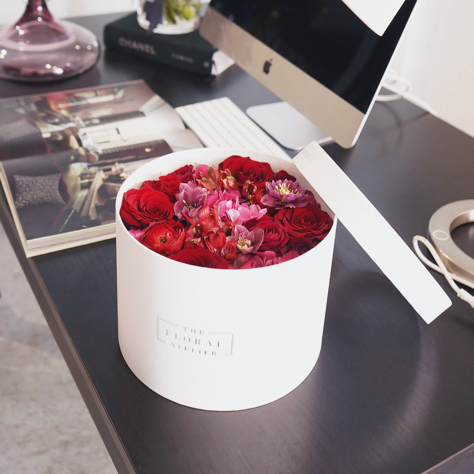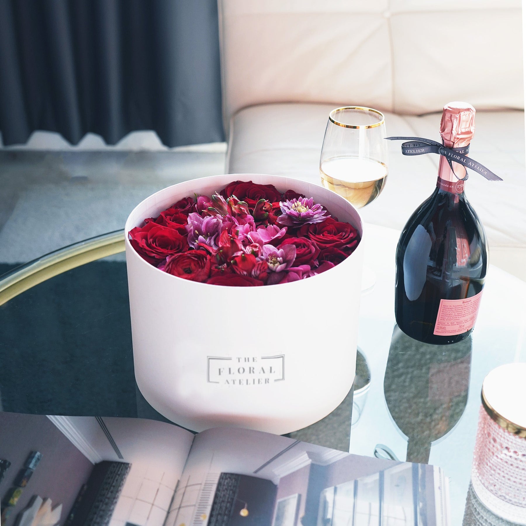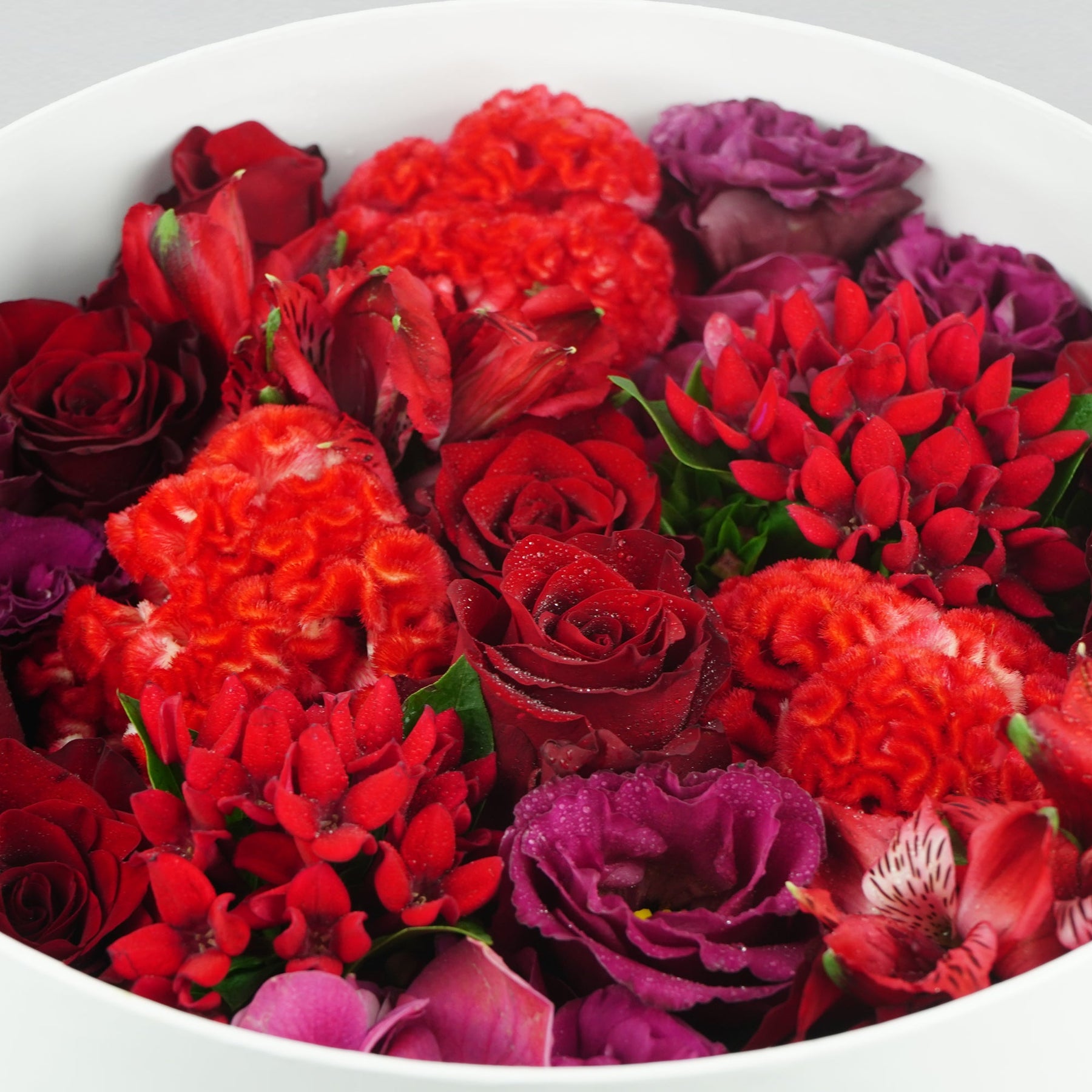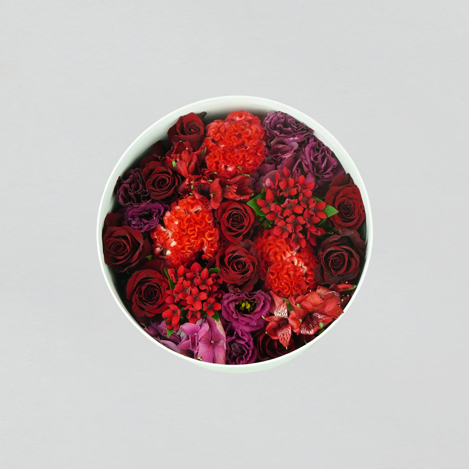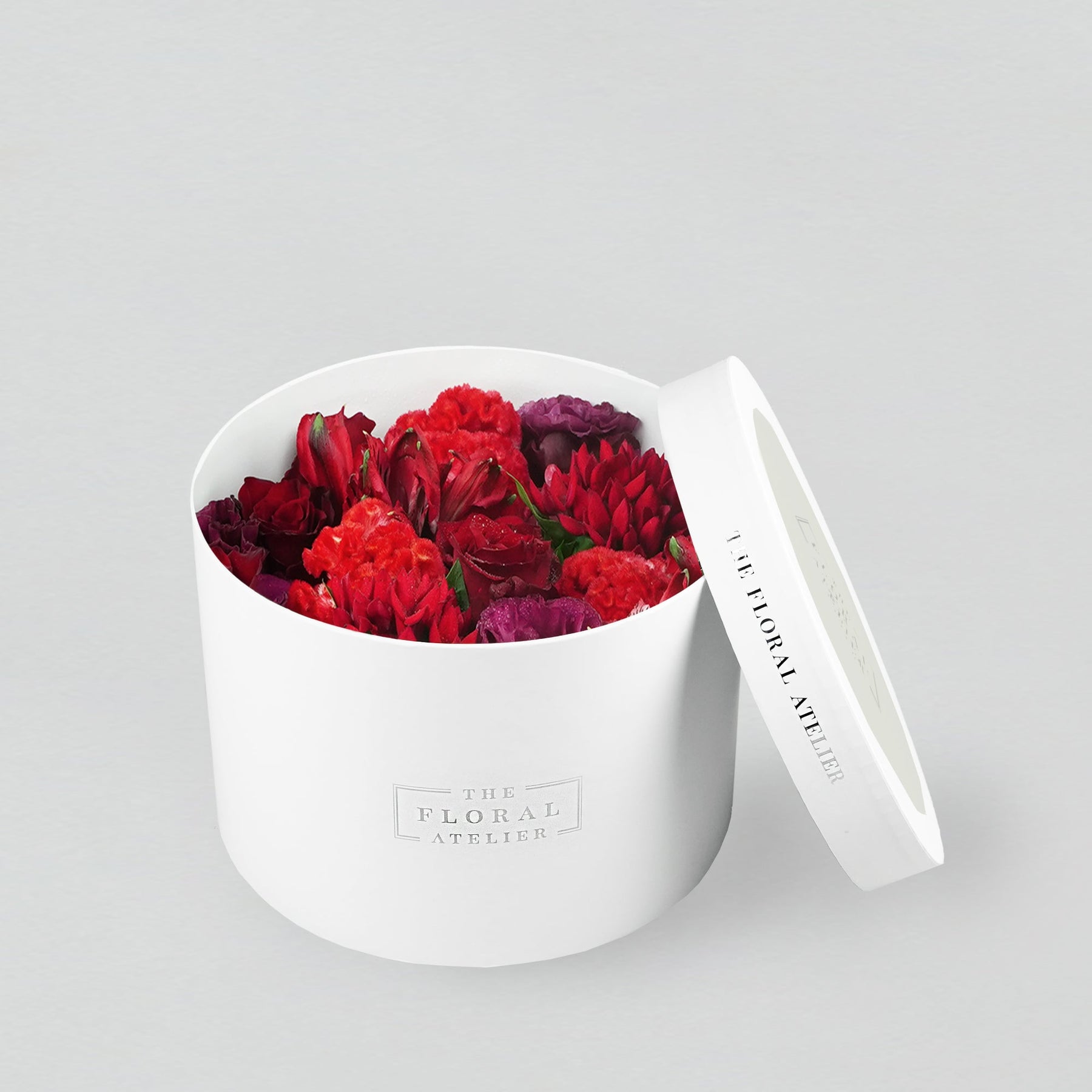 Deep crimson premium roses, bright red cockscombs, pink lilac hydrangeas, and brilliant red pink of the woods highlight this spectacular floral display of passion and desire. Gently and meticulously assembled in our signature bloom box to create a secret garden to be revealed and discovered. Beauty, Luxury, and Exceptionally crafted in Singapore.