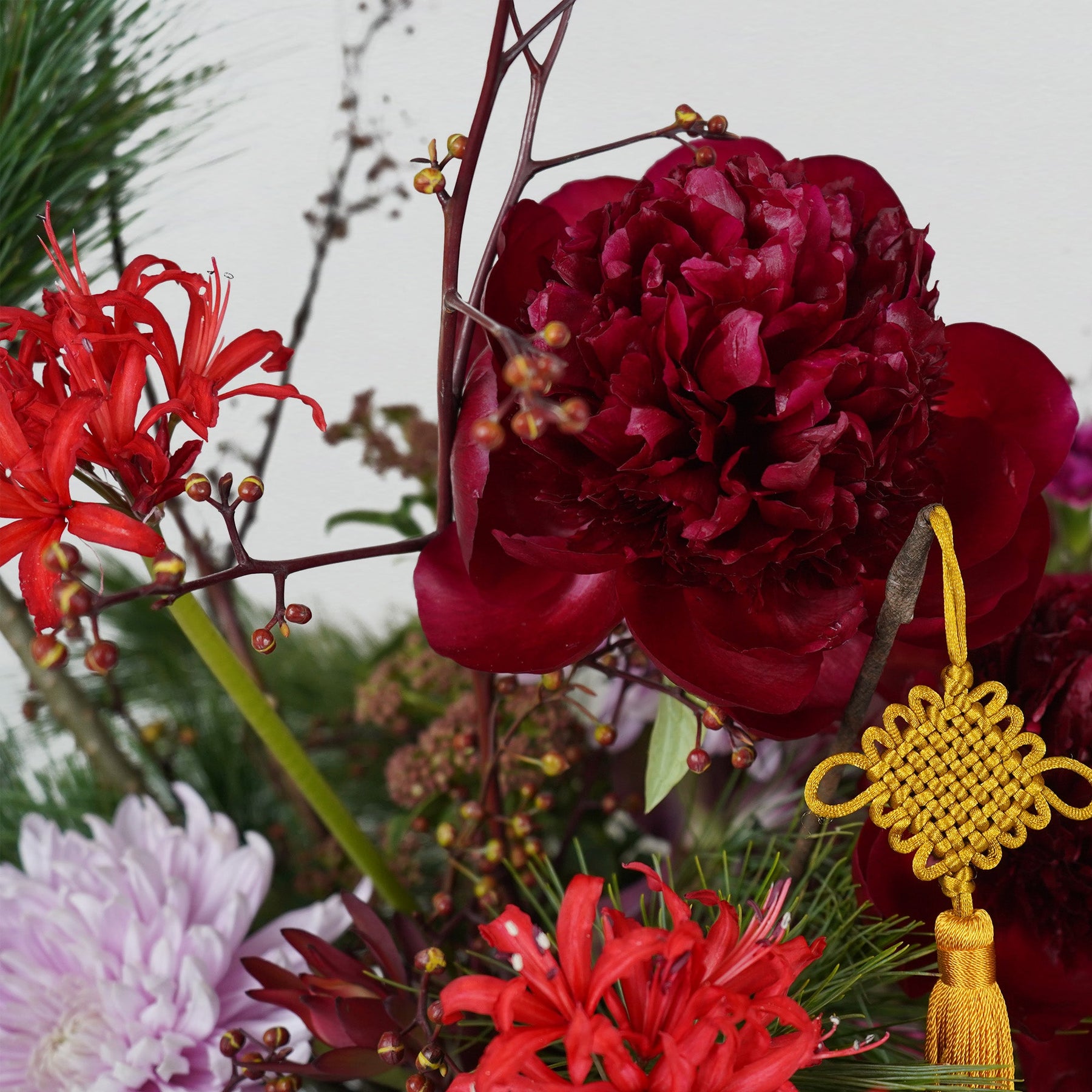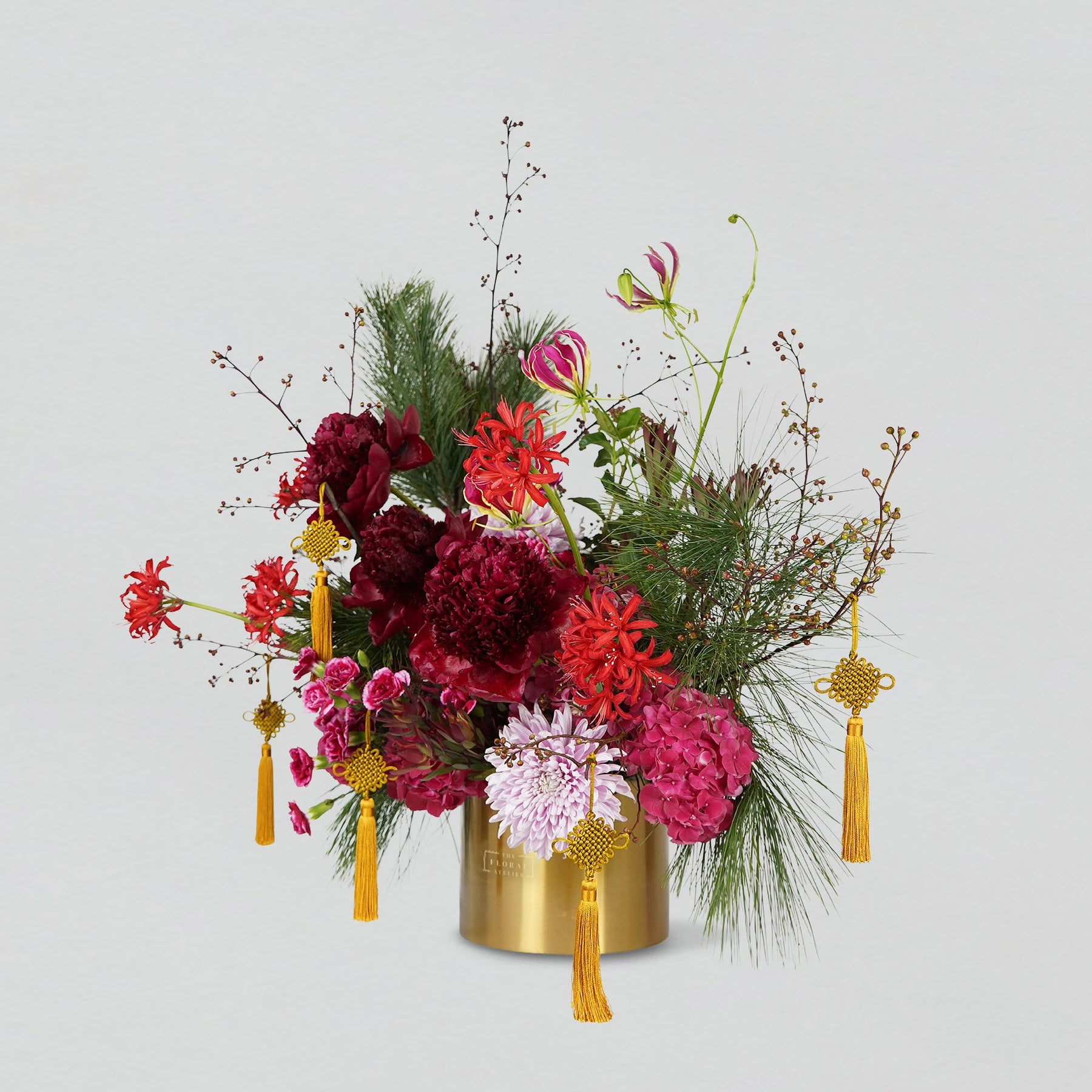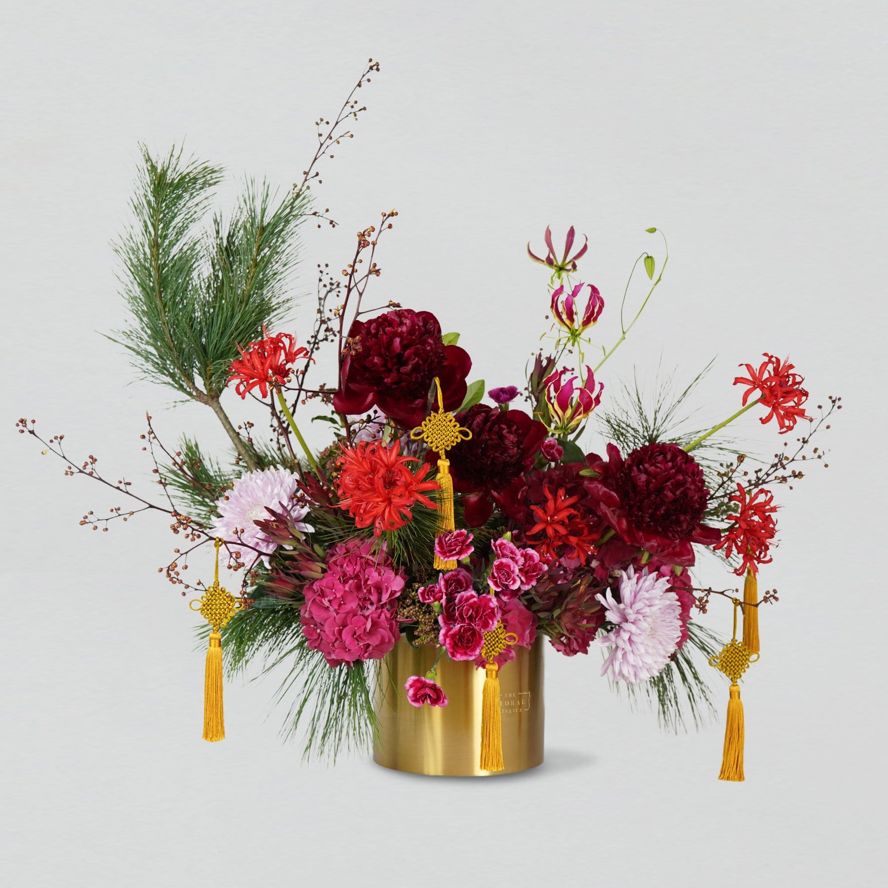 Revered for centuries as the "King of Flowers," these Peonies represent Aristocracy, Nobility, and Peak Prosperity. Presented in our exclusive gold bloom box, this artisanal composition radiates a majestic aura of Fortune and Success, adding a radiant touch to any Lunar New Year celebration. The deep, velvety tones of the blooms symbolise the momentum of growth and the flourishing strength of a prosperous year ahead.