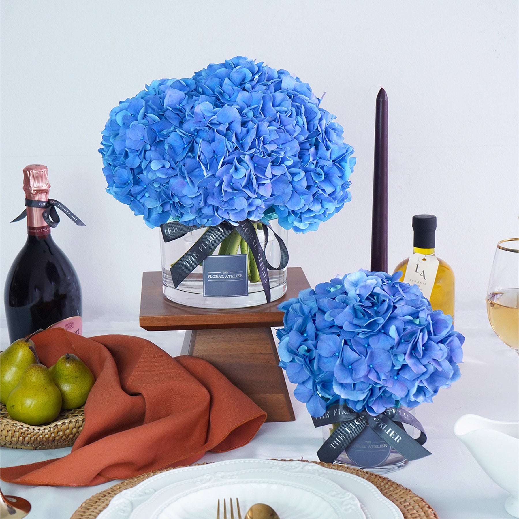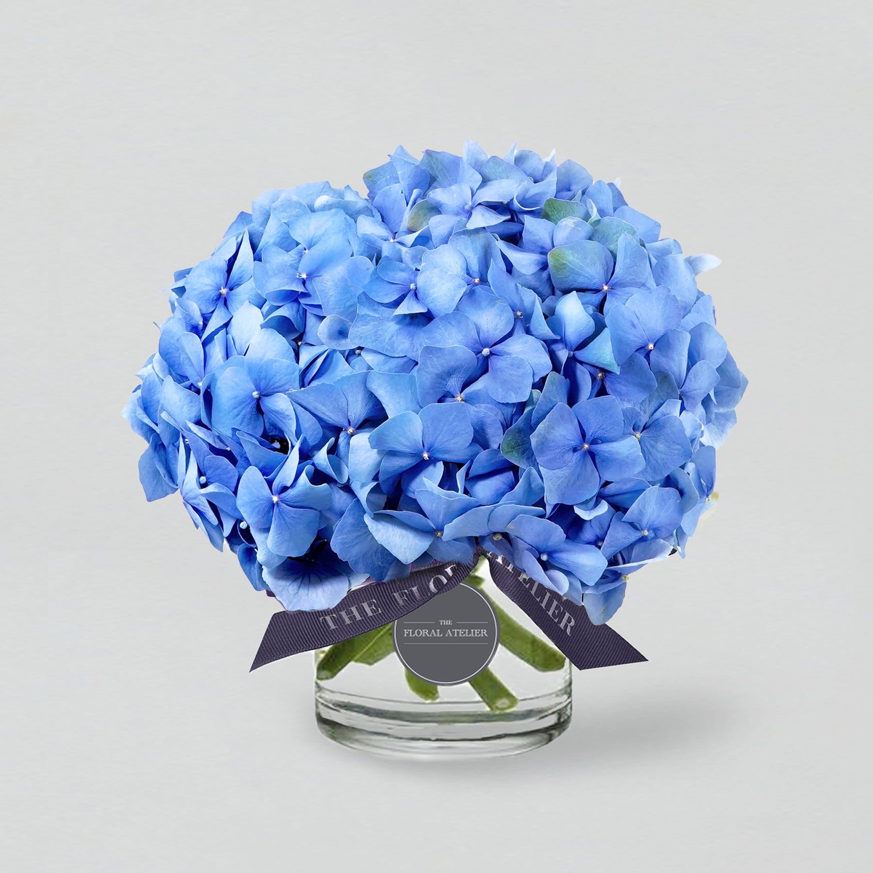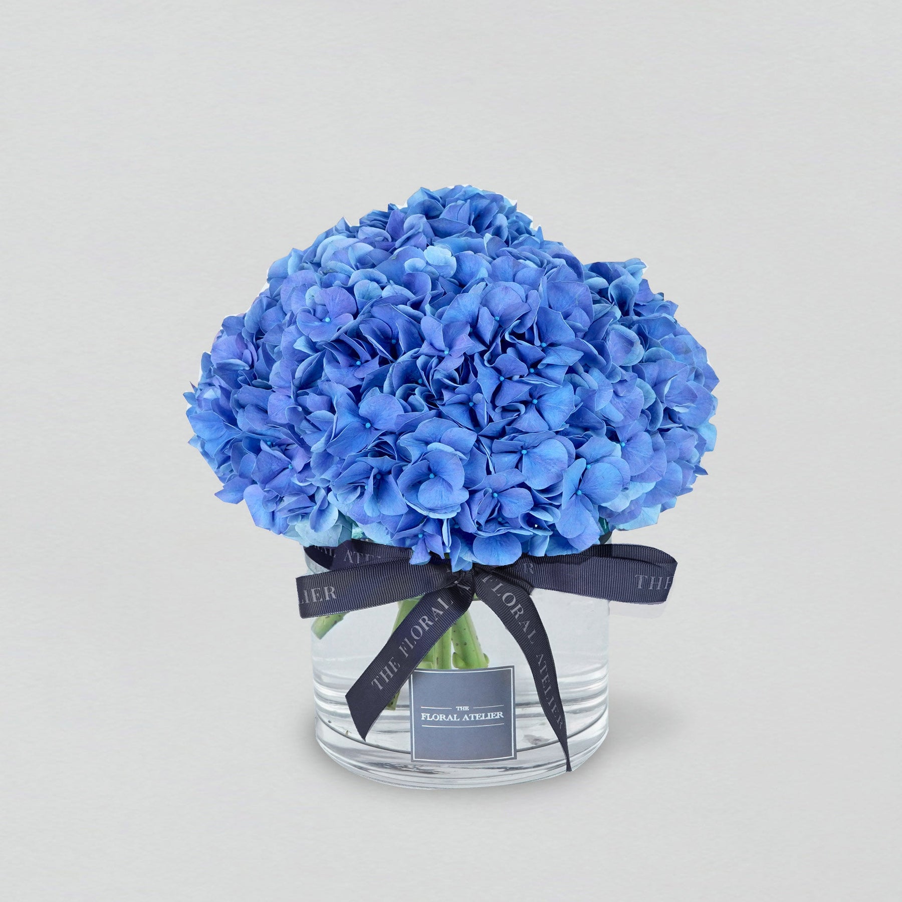 A royal and sophisticated expression of modern confidence and style, uniformly shaped to truly amplify the majestic hues of blue, from cerulean, sky, to cobalt, sculpted into a modern floral decor piece. Comes in a selected range of blue hydrangeas, depending on the season and curated varieties. Each Blue Modern creation is exquisitely crafted and packaged in our curated vase and branded ribbon. All The Floral Atelier vases can be repurposed for many other wonderful uses.