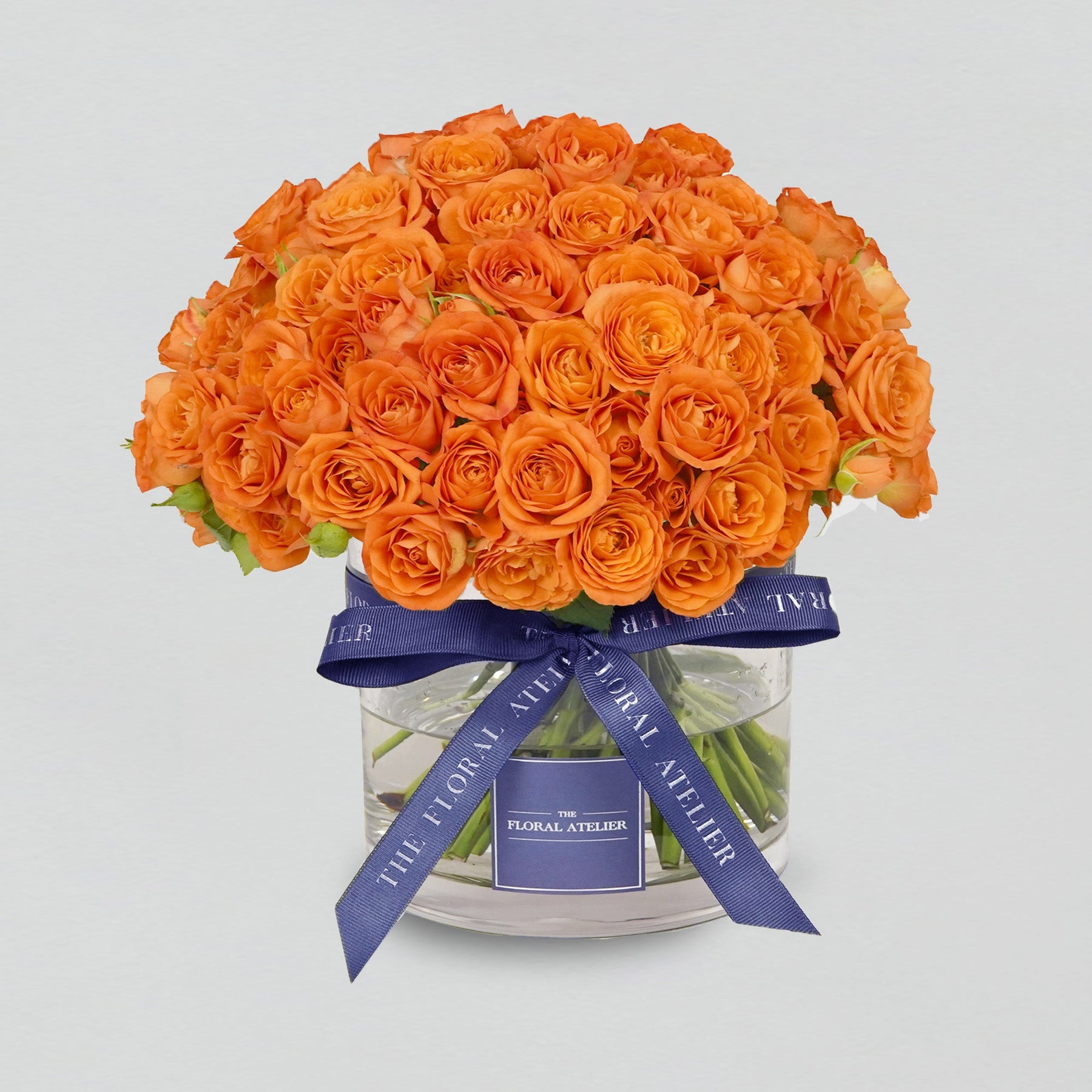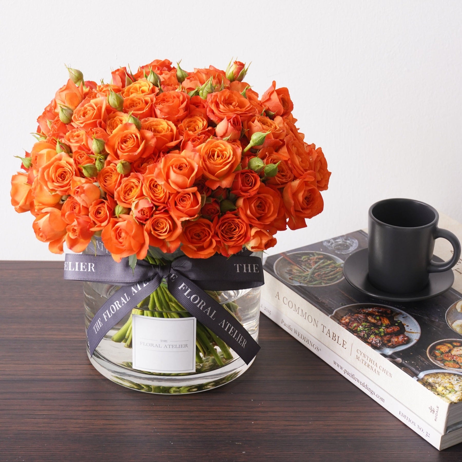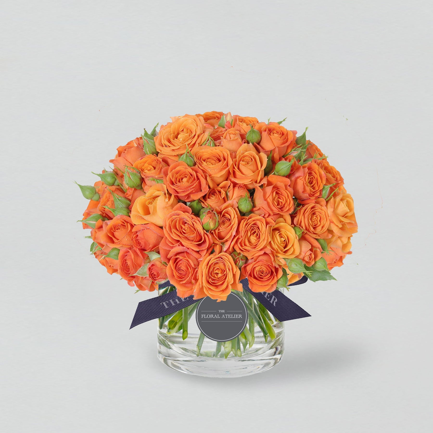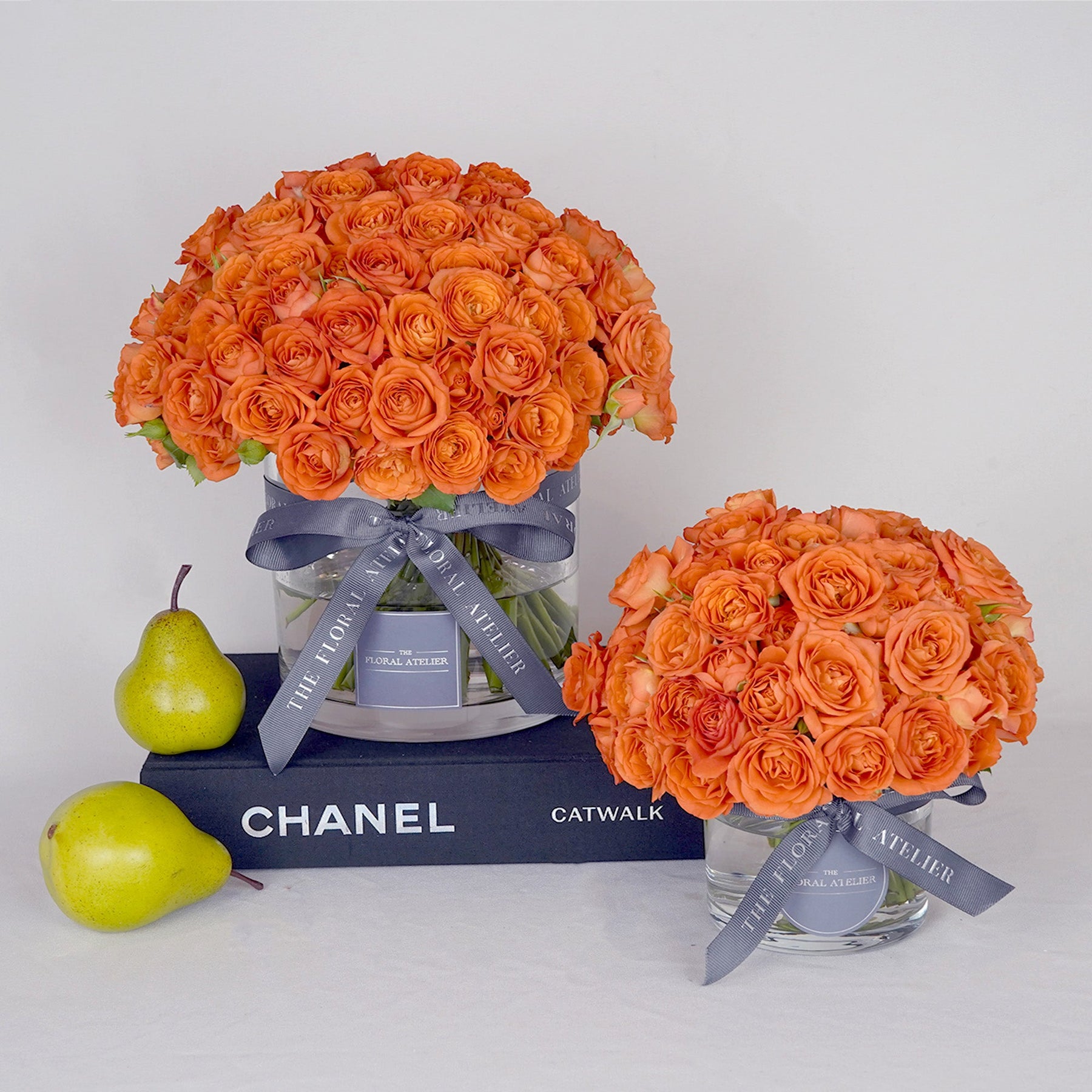 A burst of energy and enthusiasm, uniformly shaped to truly amplify the spectacular hues of orange, from sunset, desert, to royal, sculpted into a stunning modern floral decor piece. Comes in a sensational range of orange roses, depending on the season and curated varieties. Each creation is exquisitely crafted and packaged in our curated vase and branded ribbon. All The Floral Atelier vases are designed to be repurposed for many other wonderful uses.