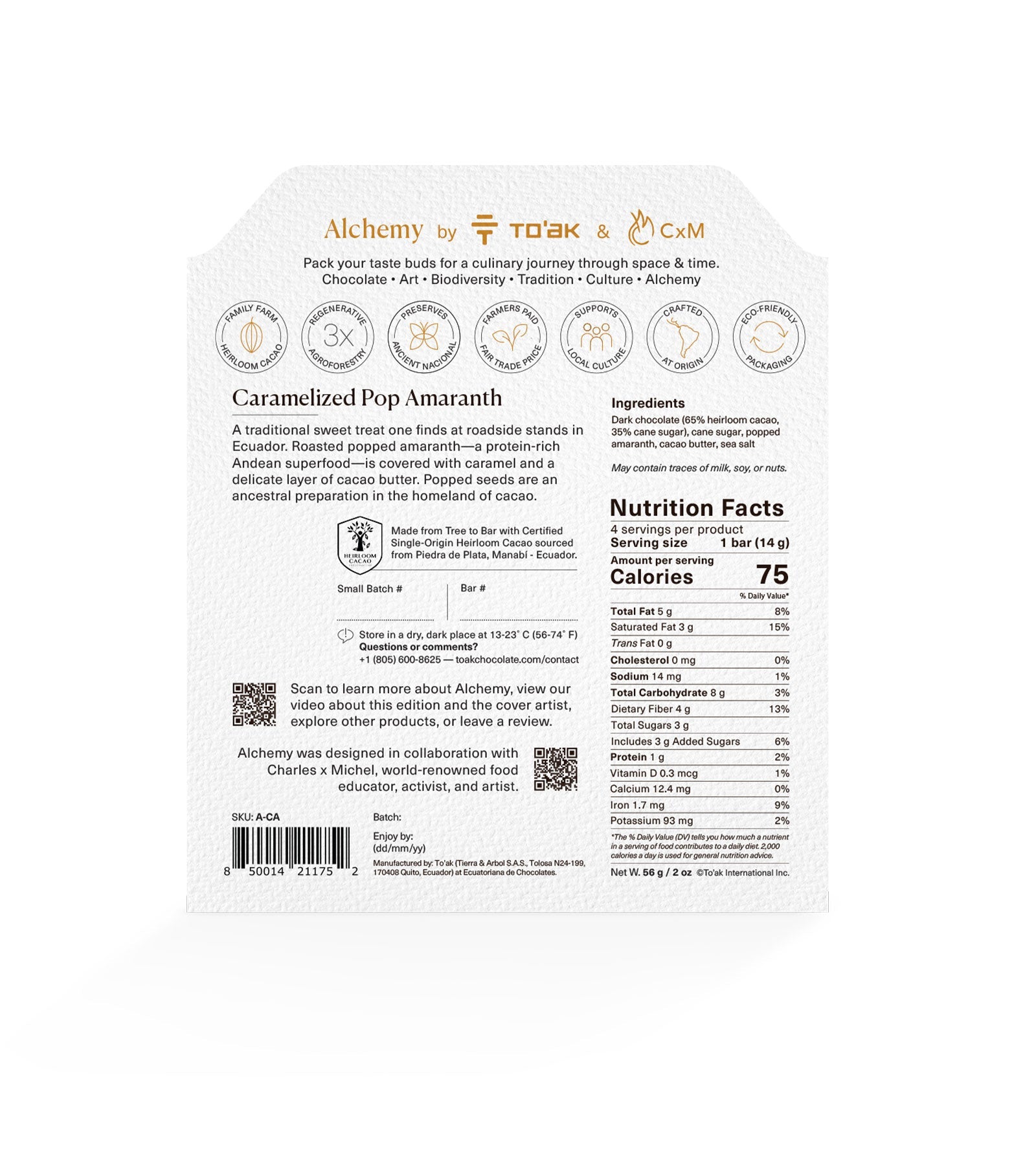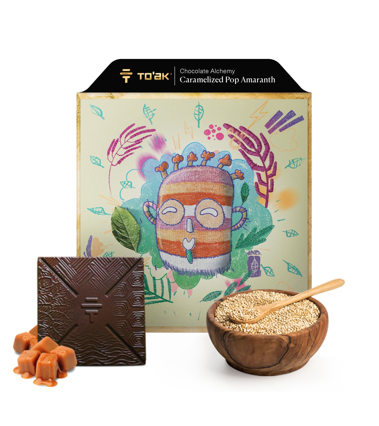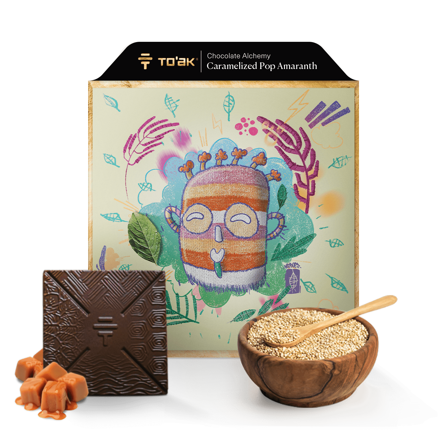 A To'ak rendition of a traditional sweet treat one finds at roadside stands in equatorial landscapes. Roasted popped amaranth—a protein-rich Andean superfood—is covered with caramel and a delicate layer of cacao butter. Popped seeds are an ancestral preparation in the homeland of cacao.