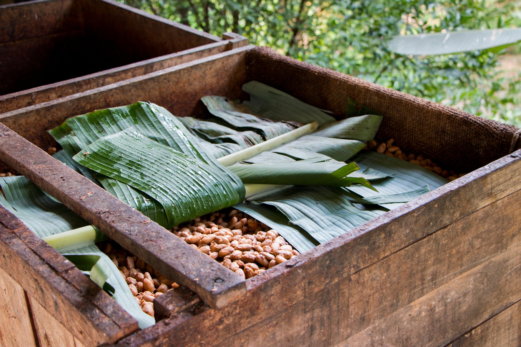 A wooden crate filled with fermented cocoa beans covered with banana leaves.