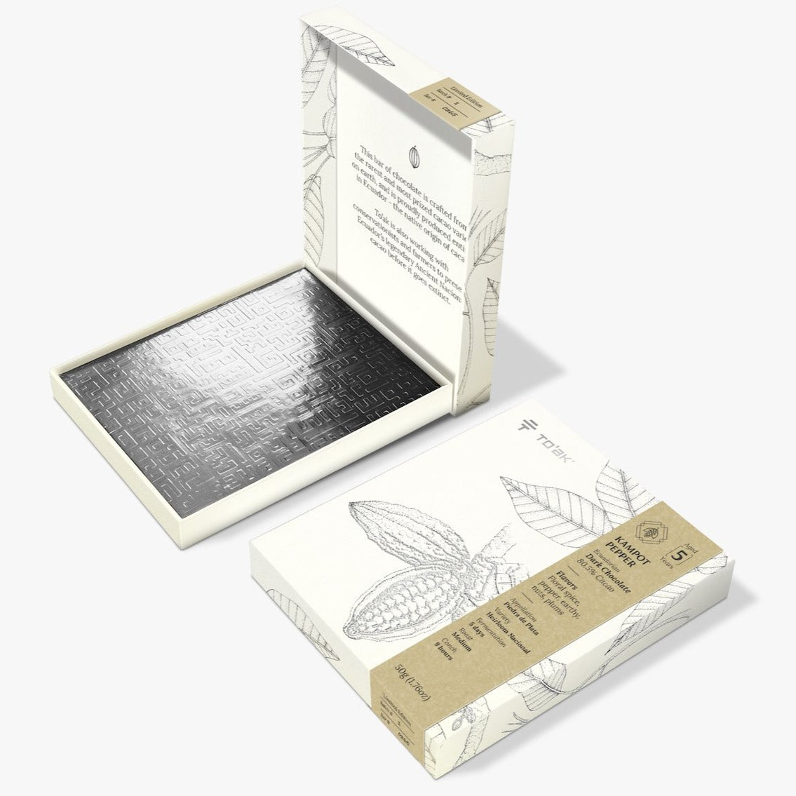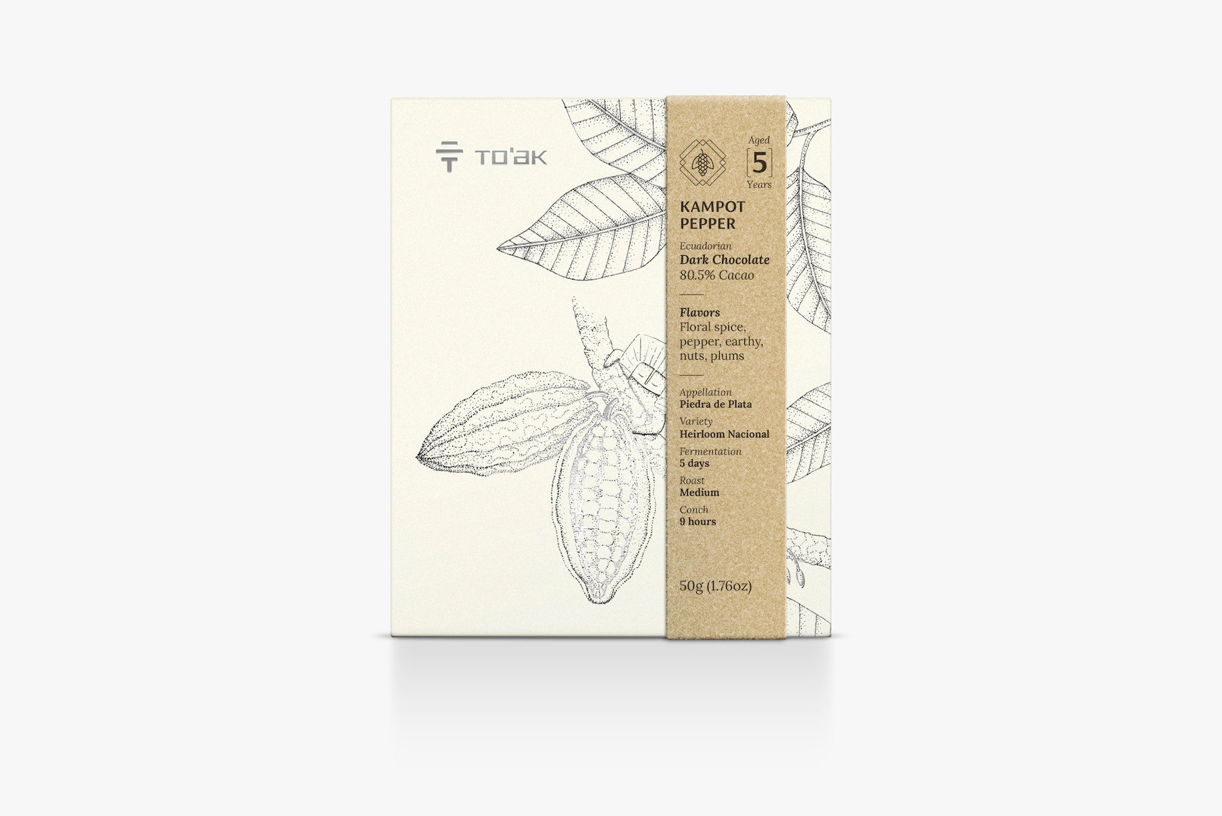 STORY: The world’s most celebrated pepper, from the Cambodian province of Kampot, meets the world’s most luxurious dark chocolate, from To’ak in Ecuador—aged for three years. A bold and floral chocolate with an artful touch of spice. Ideal for pairing with cheese, tequila, or rye whiskey.