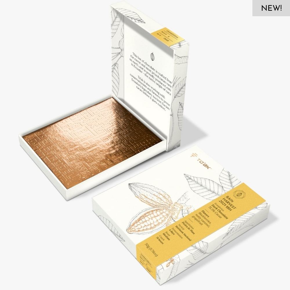 STORY: On the tails of one of the strangest years ever, the 2021 growing season was relatively normal…until the final months. Heavy rains during ripening and harvest, combined with a moderate conch, gives rise to a fruit-forward bar of To'ak chocolate—blackberry marmalade, nutty caramel.