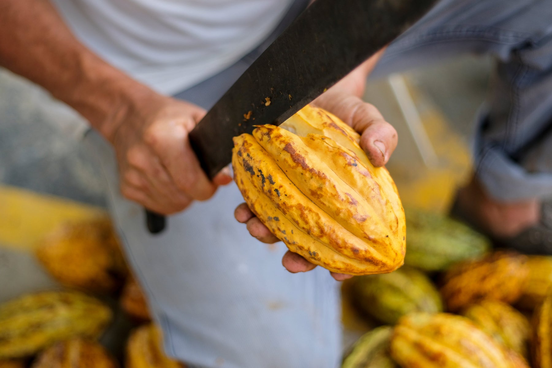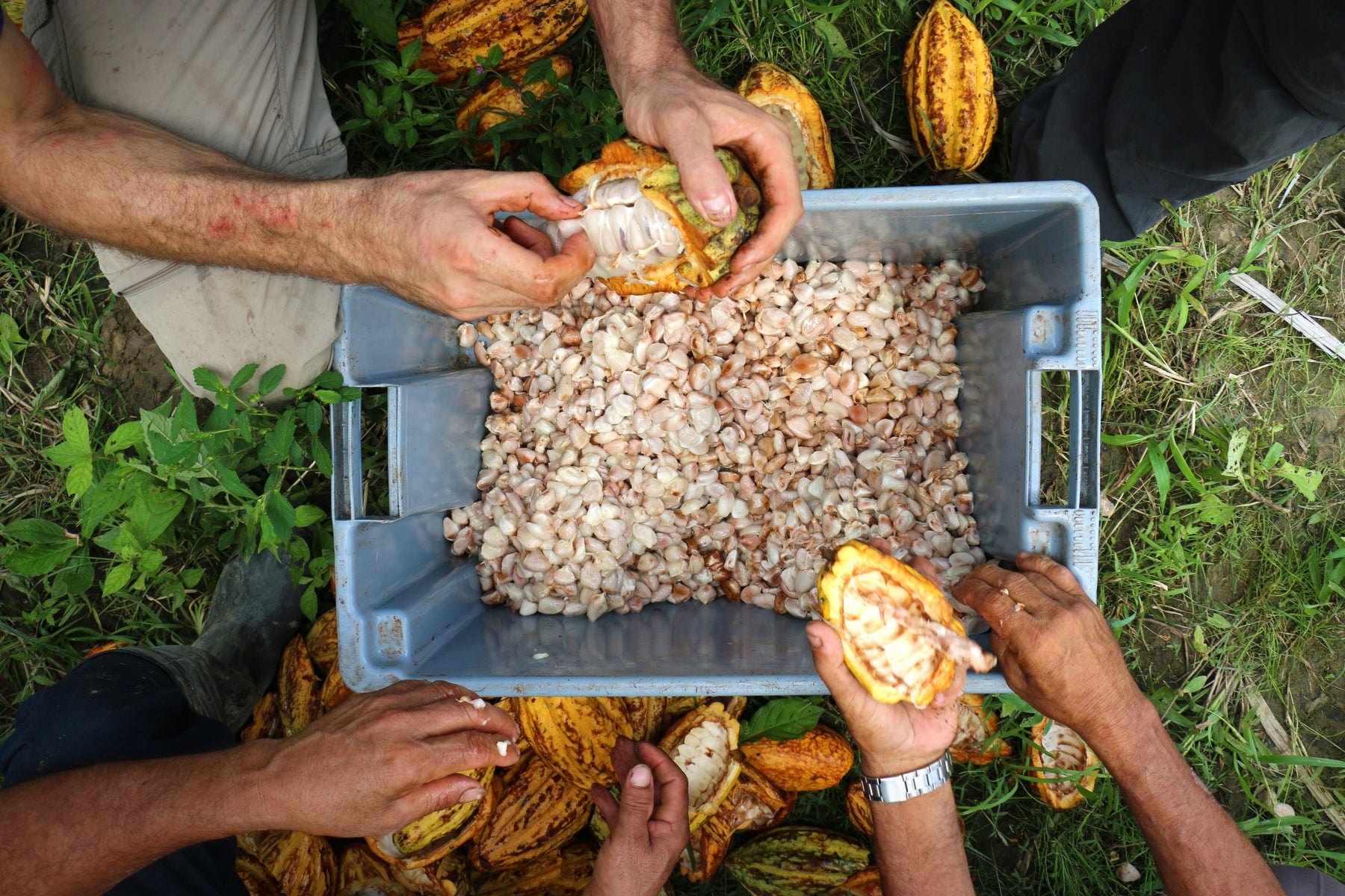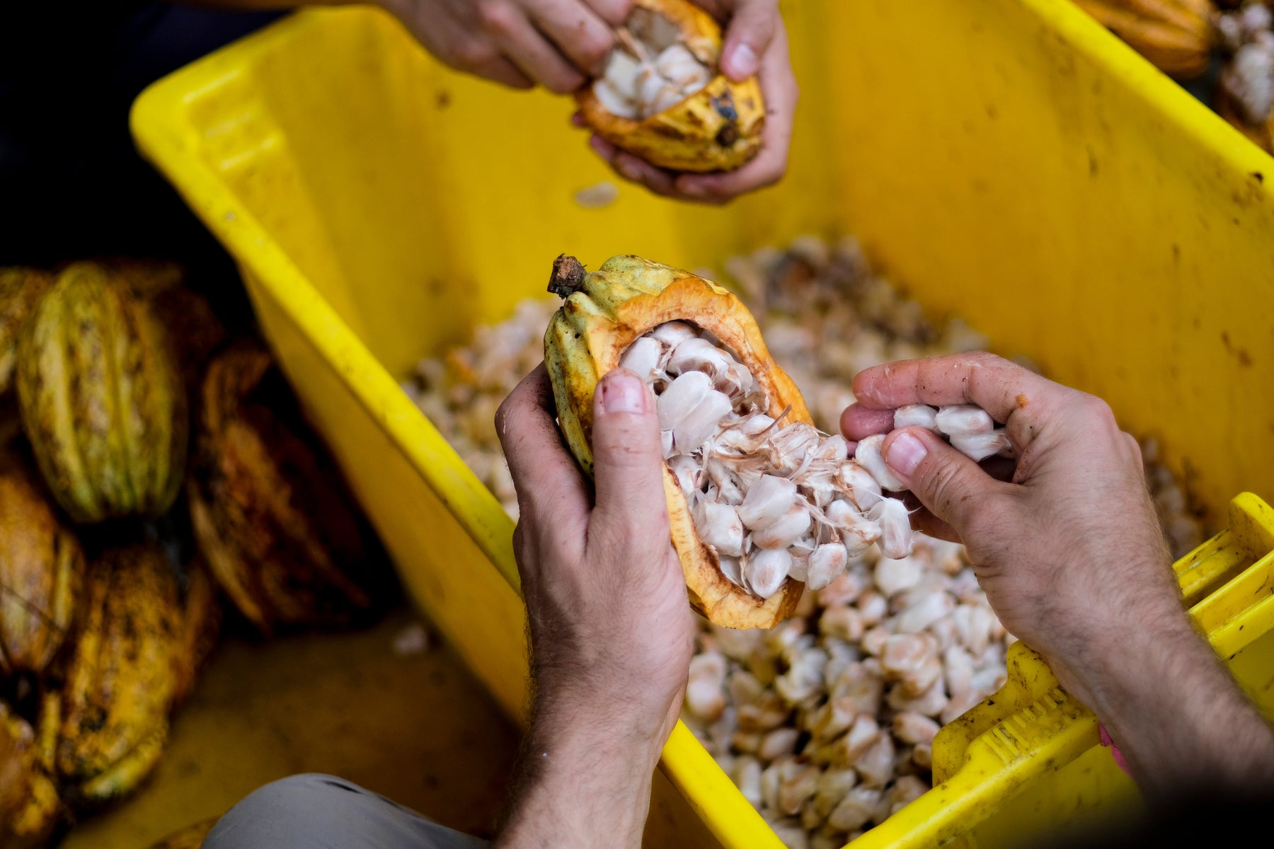 Farmers harvesting cacao beans from the cacao pod into a plastic container.