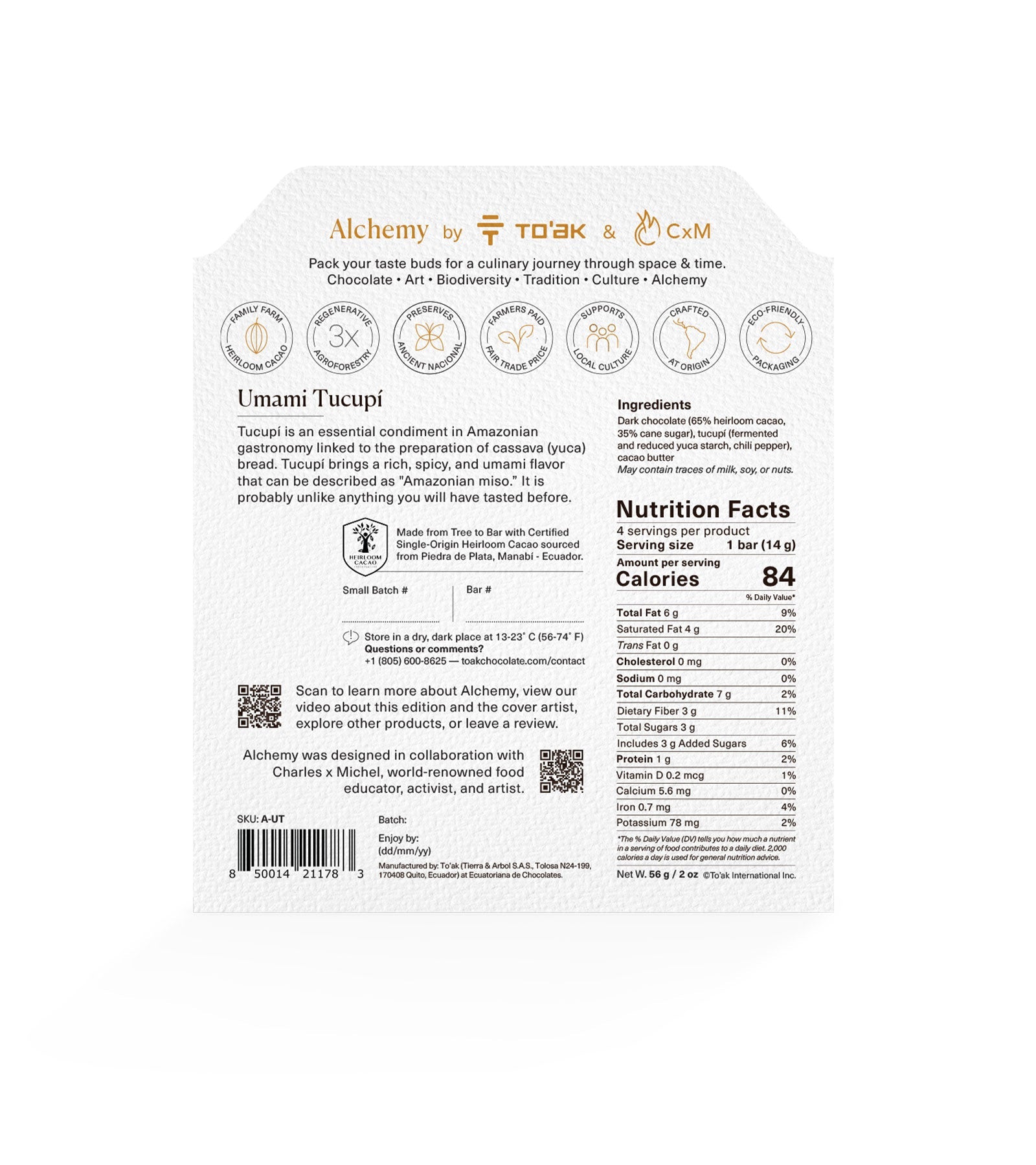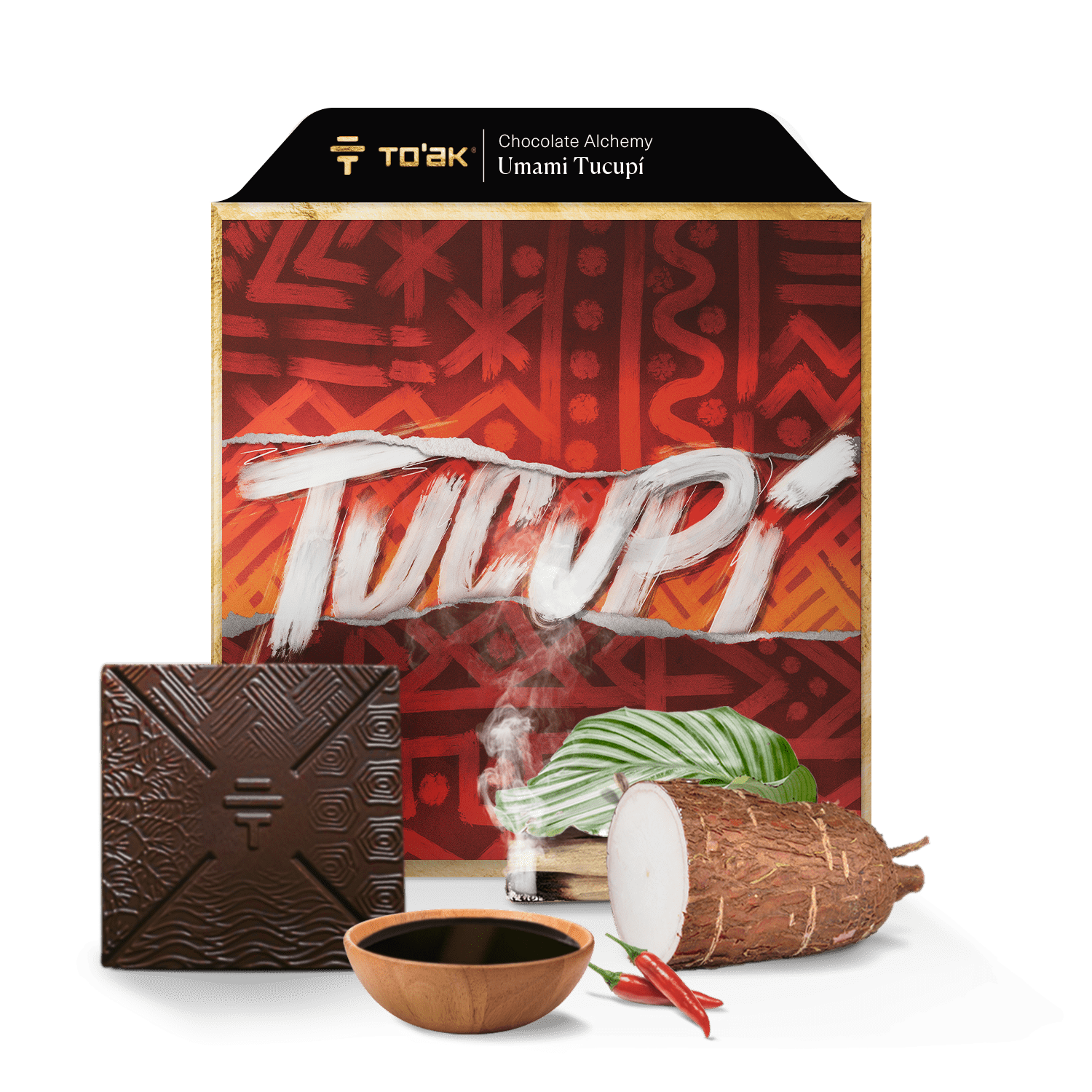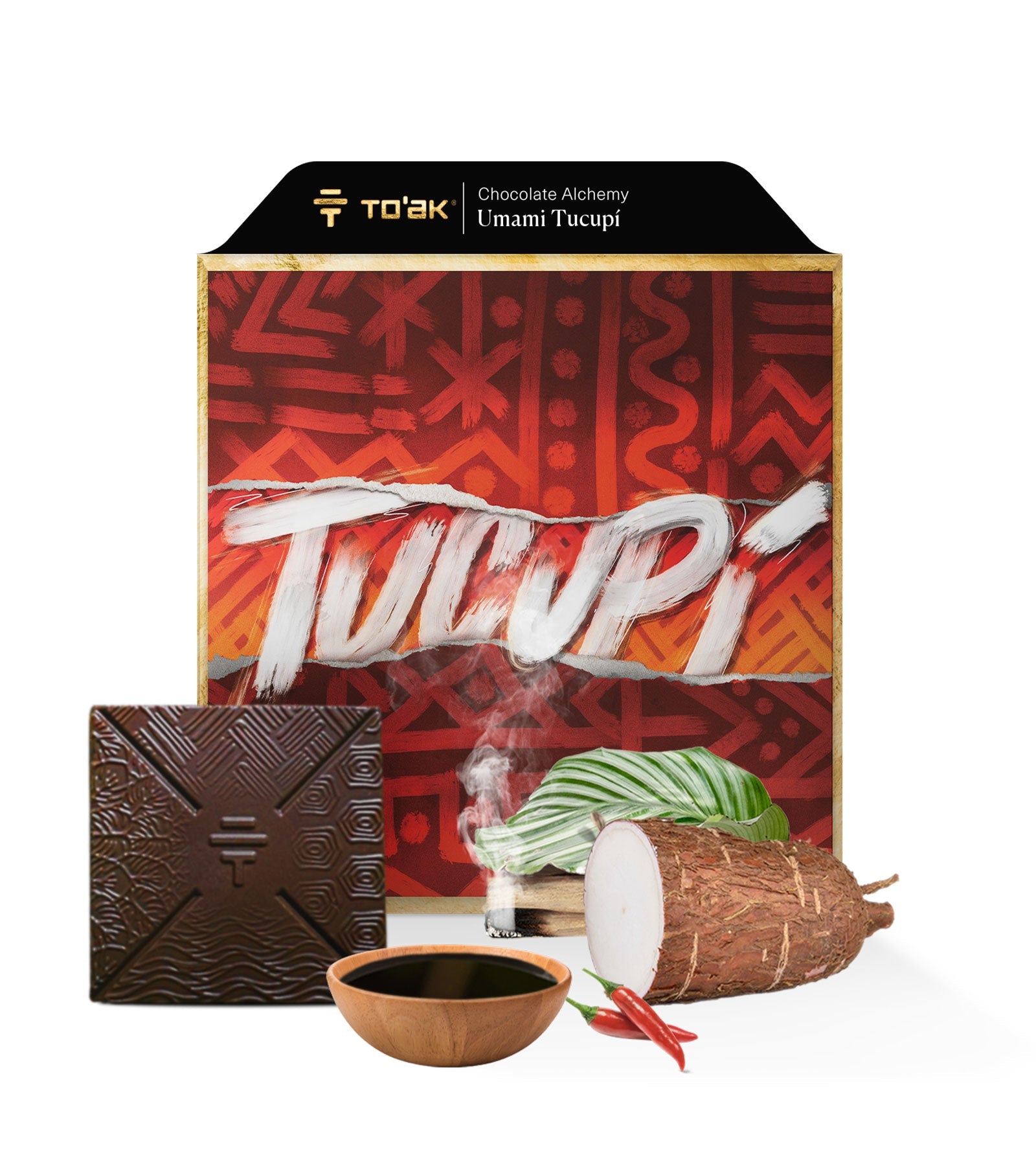 Dark chocolate (65% heirloom cacao, 35% cane sugar), tucupí (fermented and reduced yuca starch, chili pepper), cacao butter