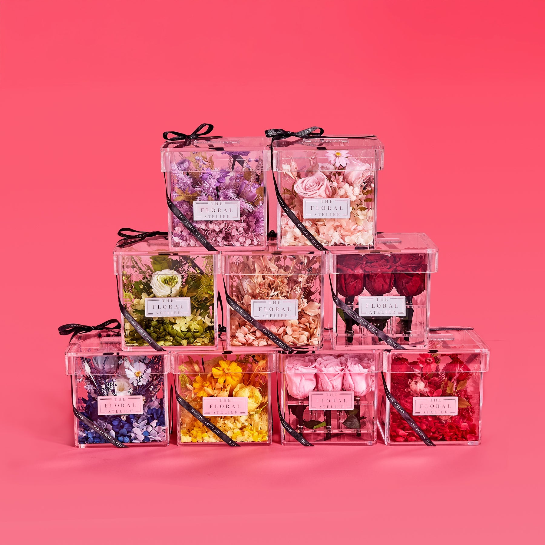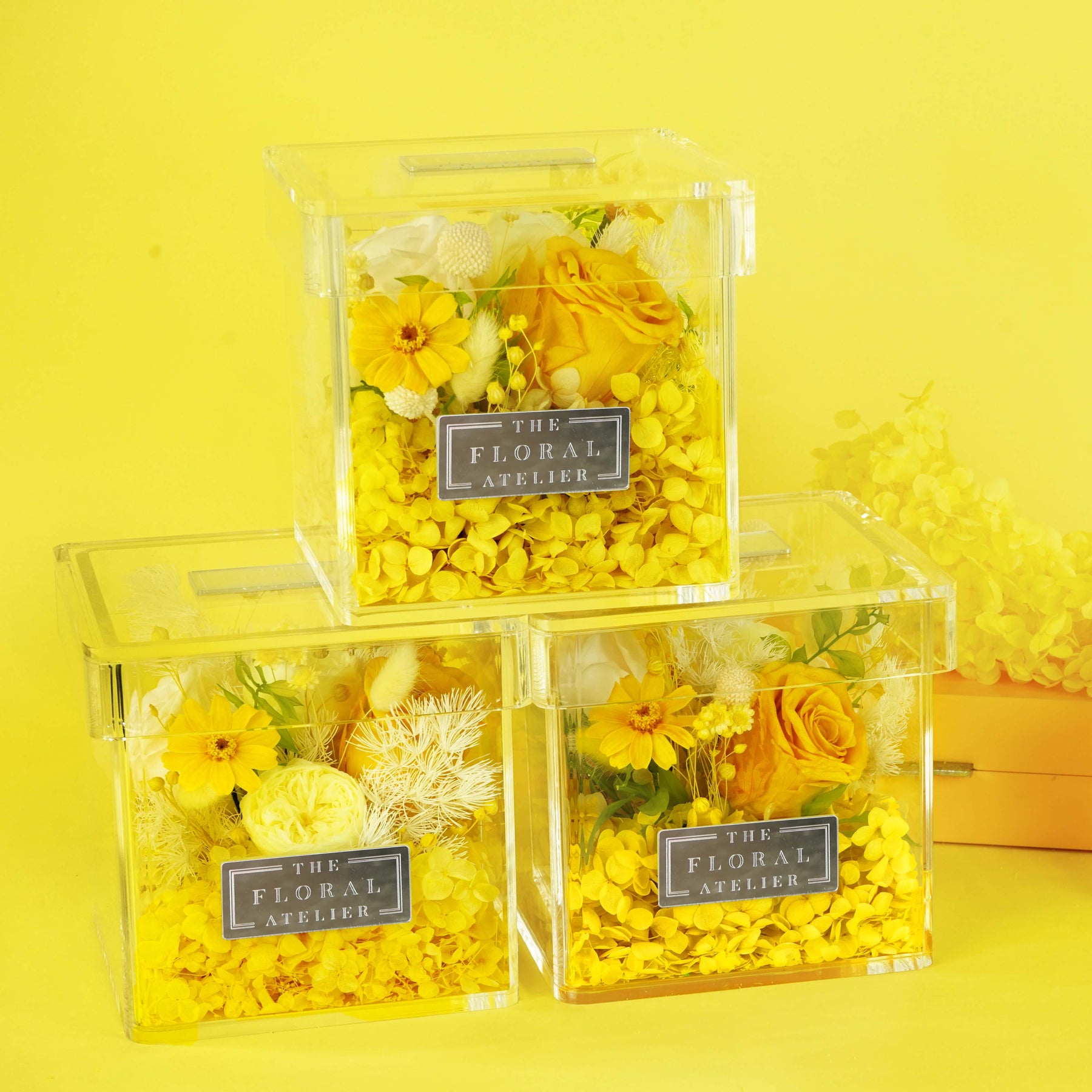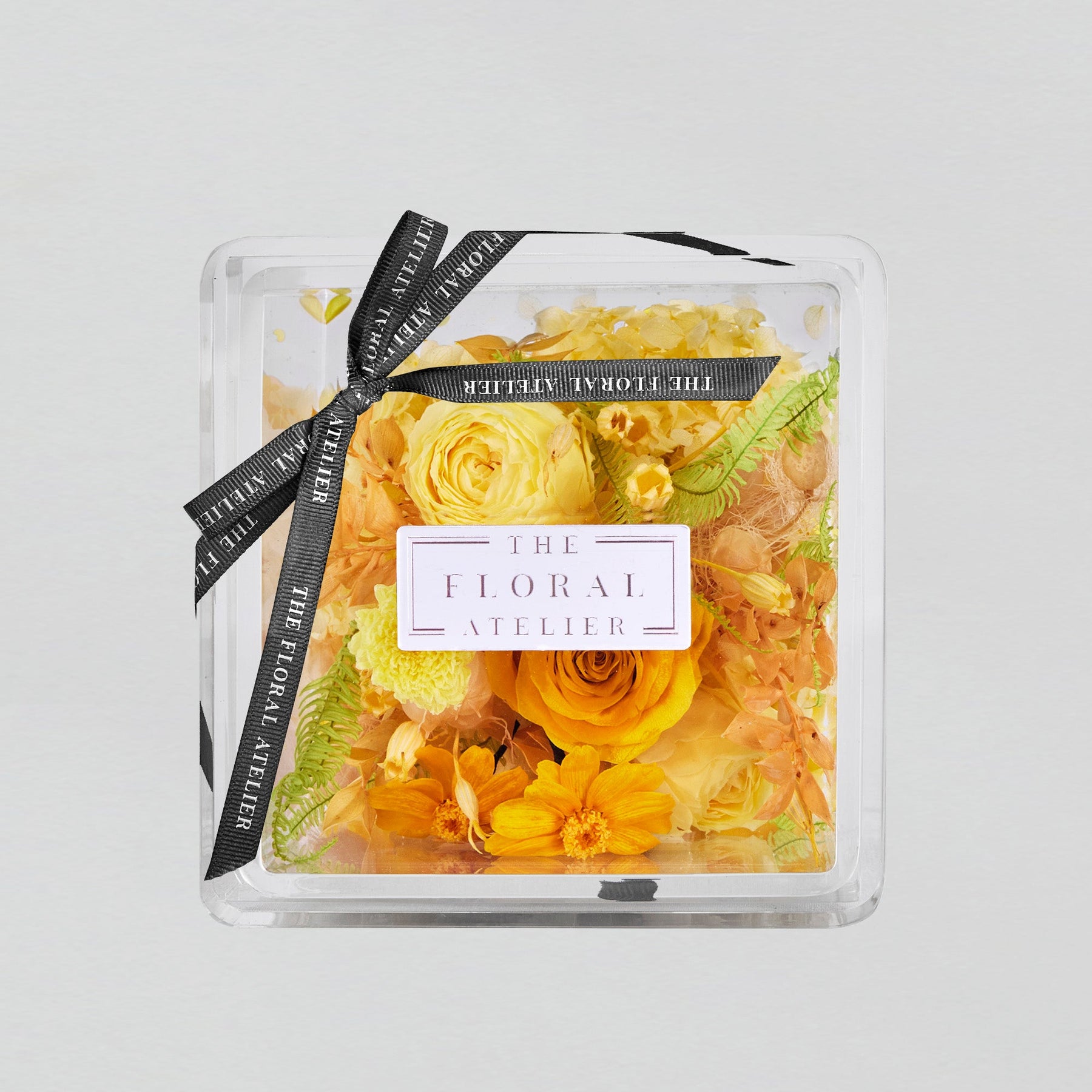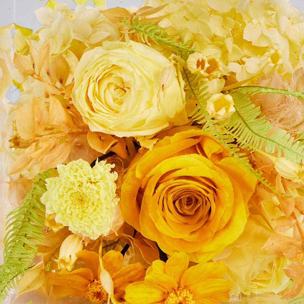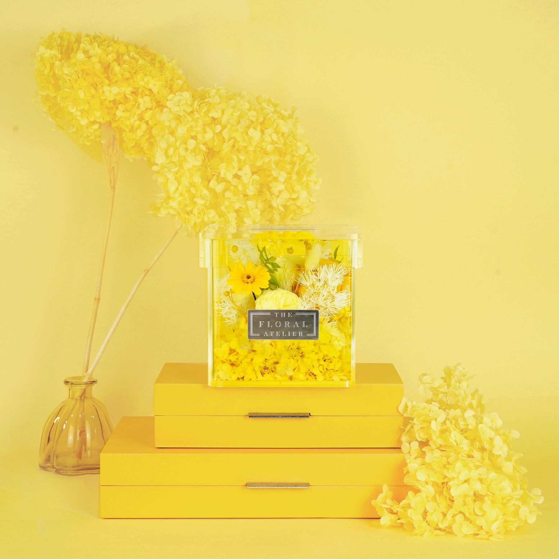 Bring your display of affection to life with our Joyful Crystal Cube, featuring an assortment of premium preserved Garden Roses, Hydrangeas and Daisies in sprightly yellows that stands out in the eyes and minds of that special someone.