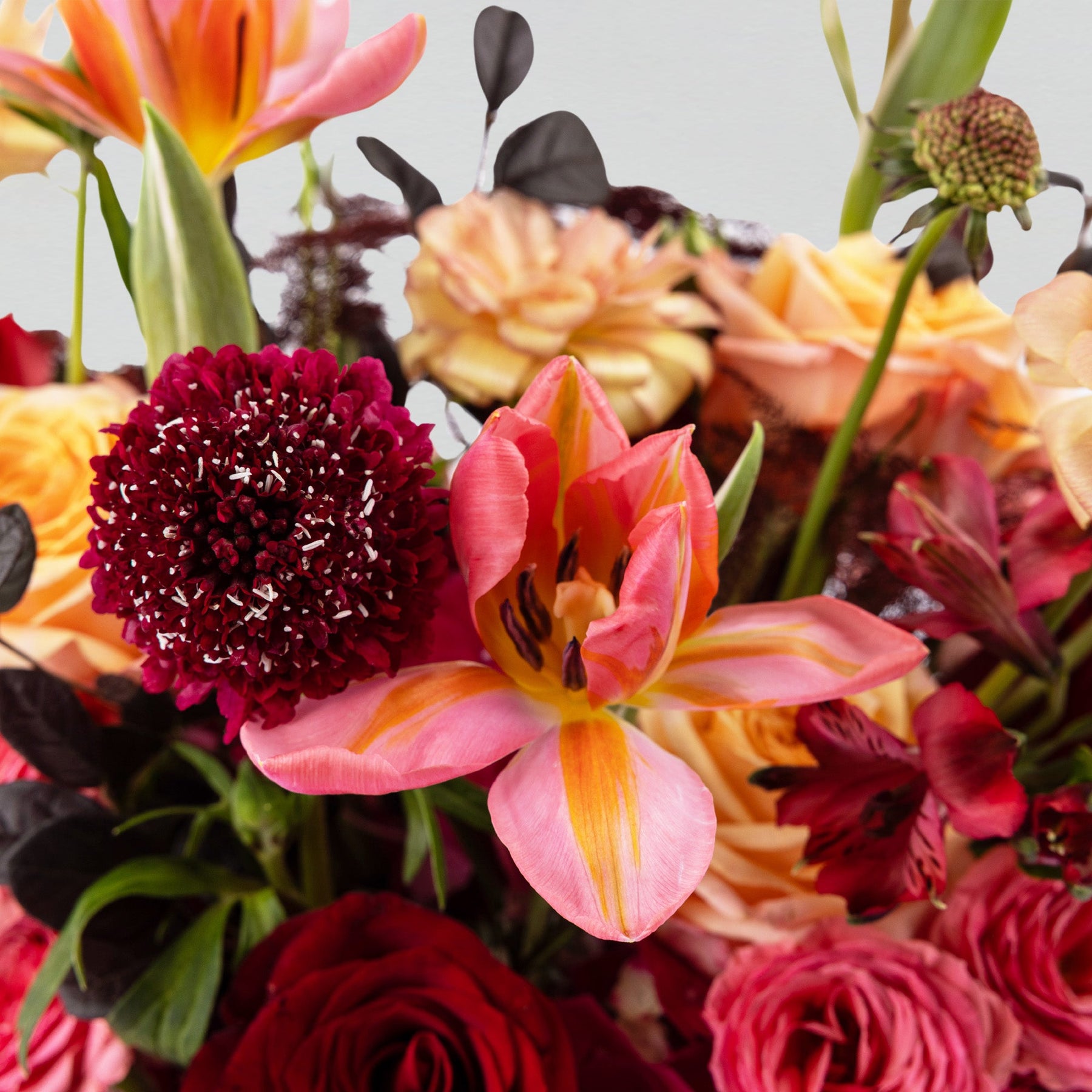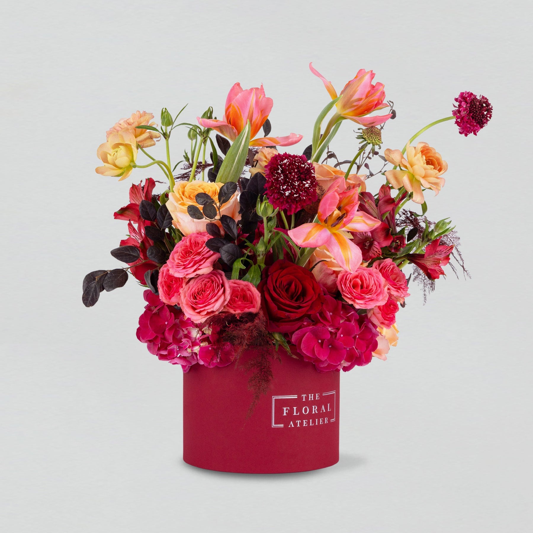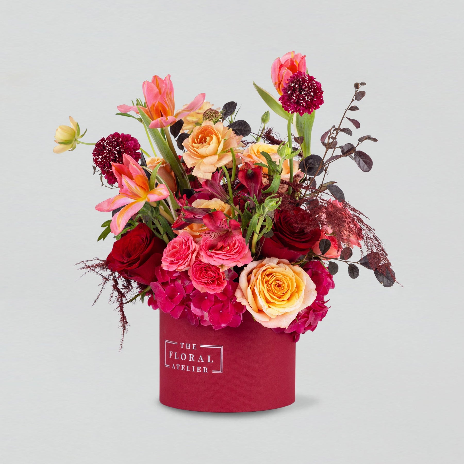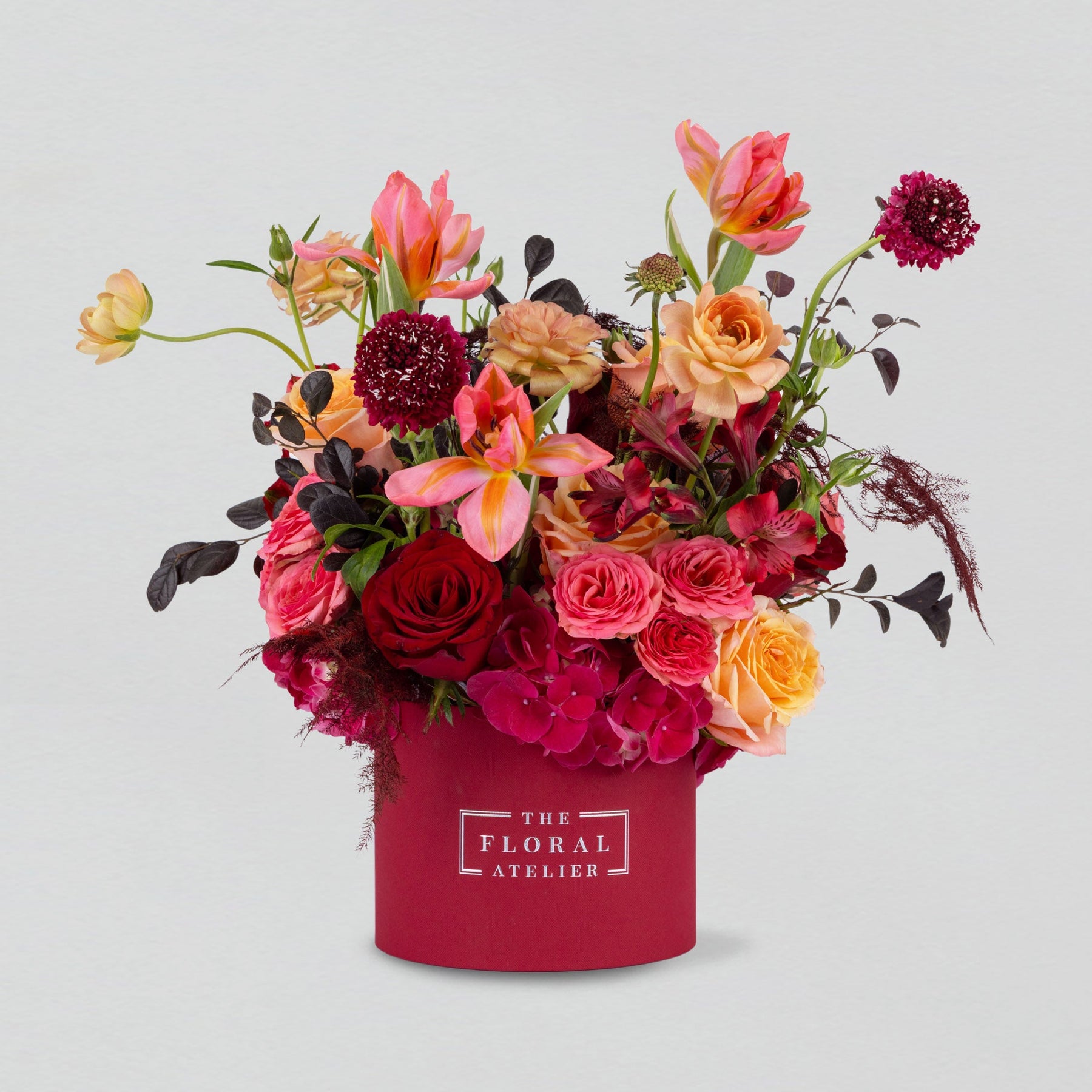 The Cherished Moments Petite Bloom Box brings together Dark Scabiosa, a Tulip at the centre, and peach and red Garden Roses, forming a composition that feels intimate yet animated. Perfect for someone whose presence is treasured and whose spirit is lively and dynamic.